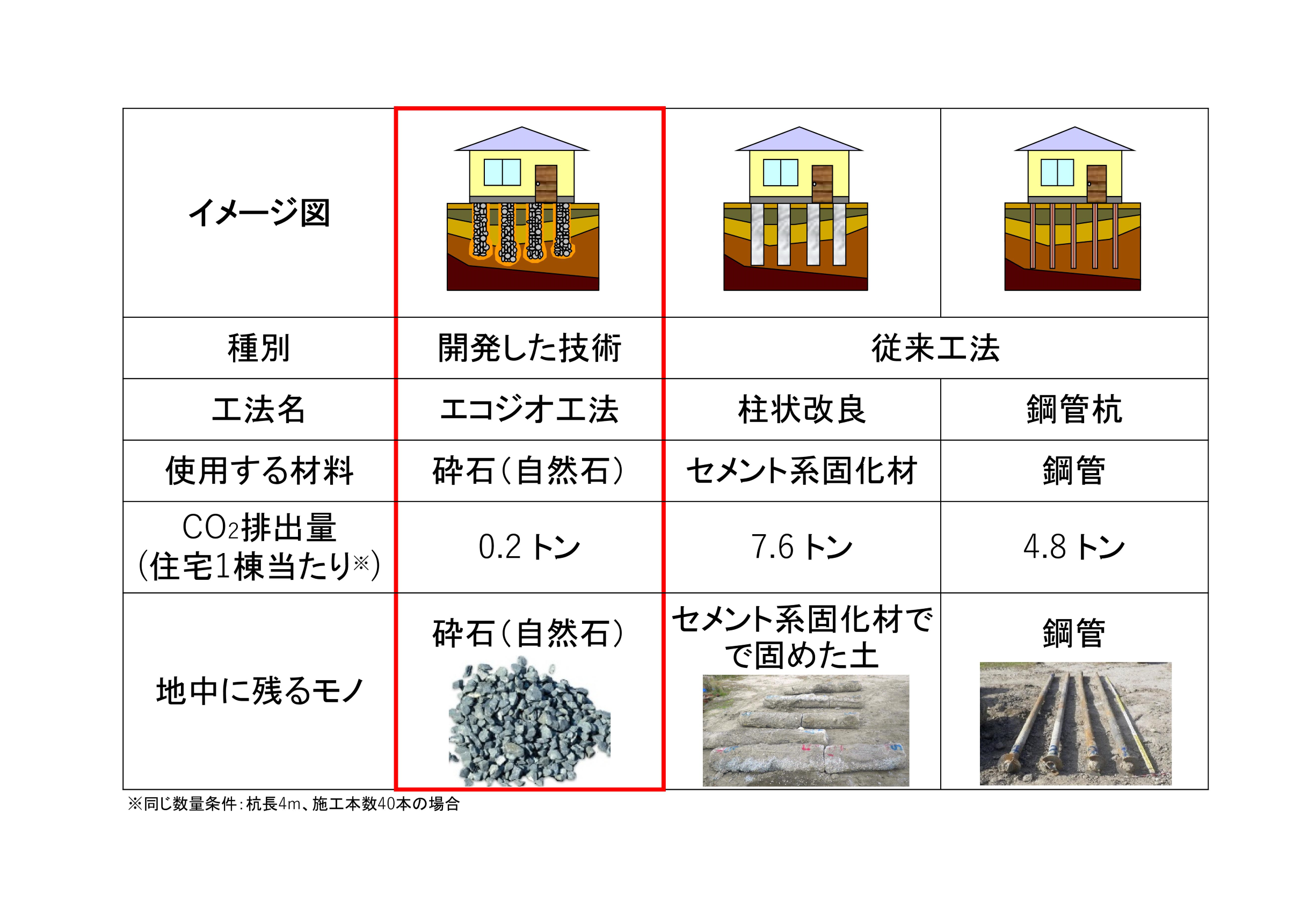 同一条件で地盤改良した場合、1棟当たりの使用材料の生産で排出されるCO2排出量はセメントや鋼管杭の20~40分の1程度。また従来工法では施工時にセメントの空袋や切断した鋼管が廃棄物として発生するが、砕石は必要な量を砕石工場からダンプカーで運搬するため現場で廃棄物は発生しない。