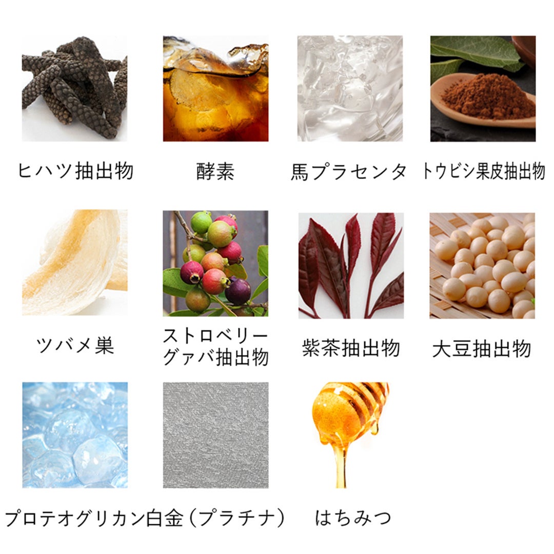 「ぷるっとヴィーナスリッチ」には、バストや肌に弾力を与える効果が期待されるグラマリズムエラスチン®やプロテオグリカンなど、注目の美容成分がたっぷり配合されています。これらの成分が内側から肌やバストケアをサポートします。