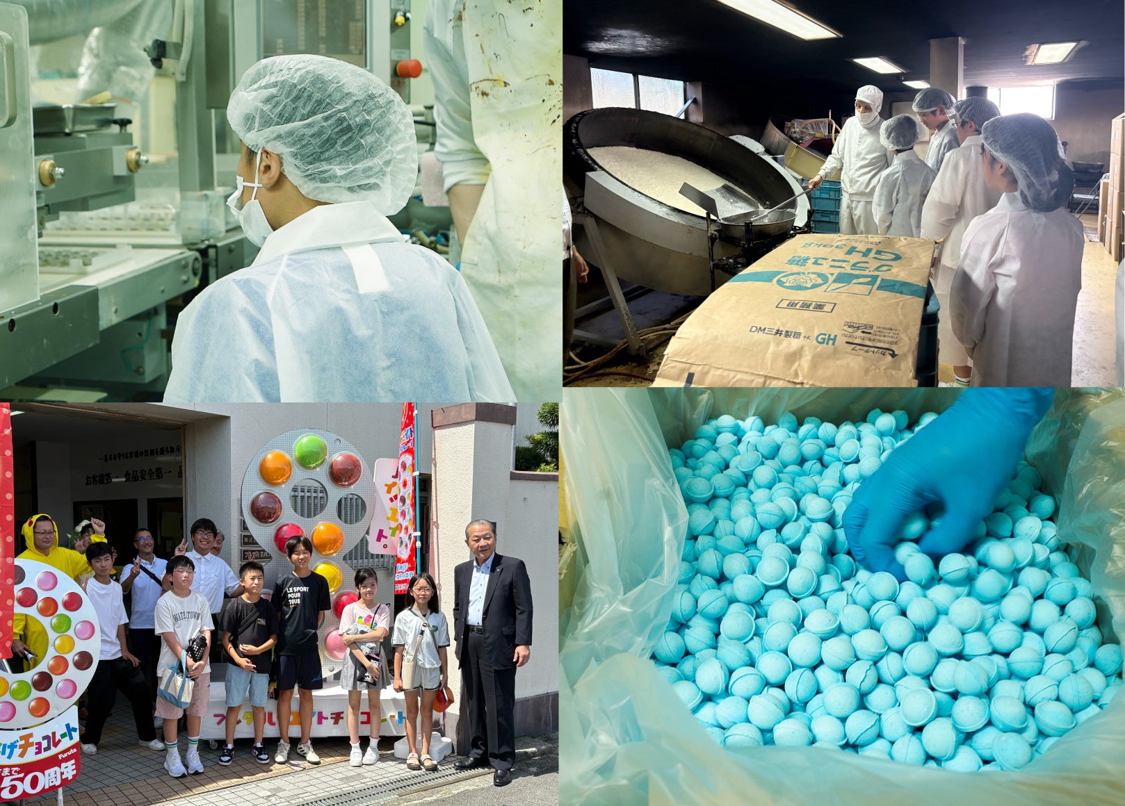 今回は、子どもたちへのオープンファクトリーと称して、普段は一般公開されていないお菓子工場を特別に見学することからスタート。こんぺいとうの『佐々木製菓』、おかきの『高橋製菓』、駄菓子の『丹生堂本舗』、「チョコエッグ」などのチョコレート菓子が有名な『フルタ製菓』の計4社のお菓子工場を班に分かれて、2社見学する流れでした。お菓子ができるまでの過程を直近で観察したり、そこで働く大人の話を聞いたり、試食したりと、五感を使って学びました。
