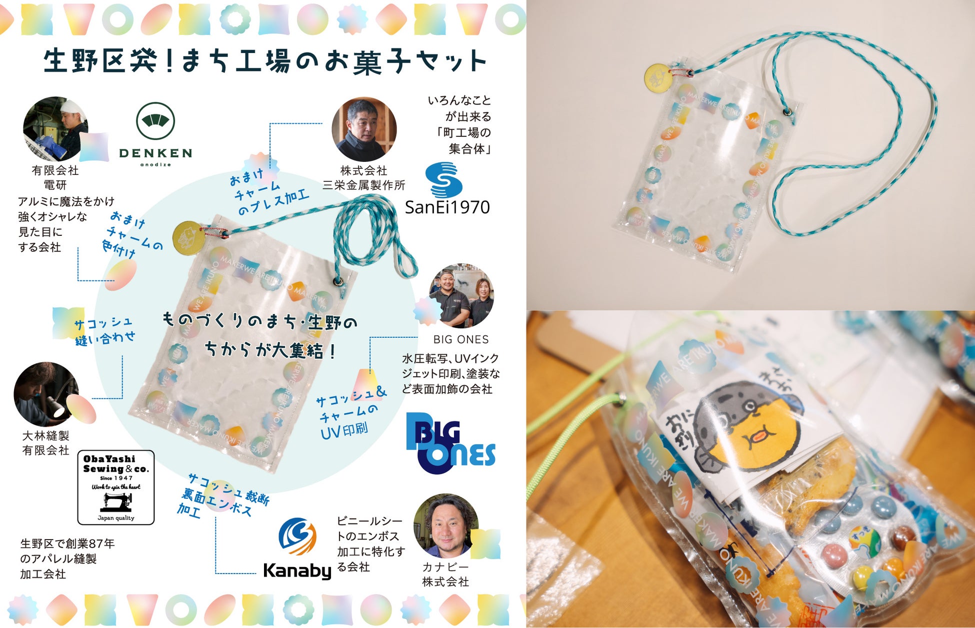 ものづくりのまち生野の大人たちが協力して仕立てたオリジナルデザインのサコッシュに詰め合わせた「まち工場のお菓子セット」(価格:1,000円込)