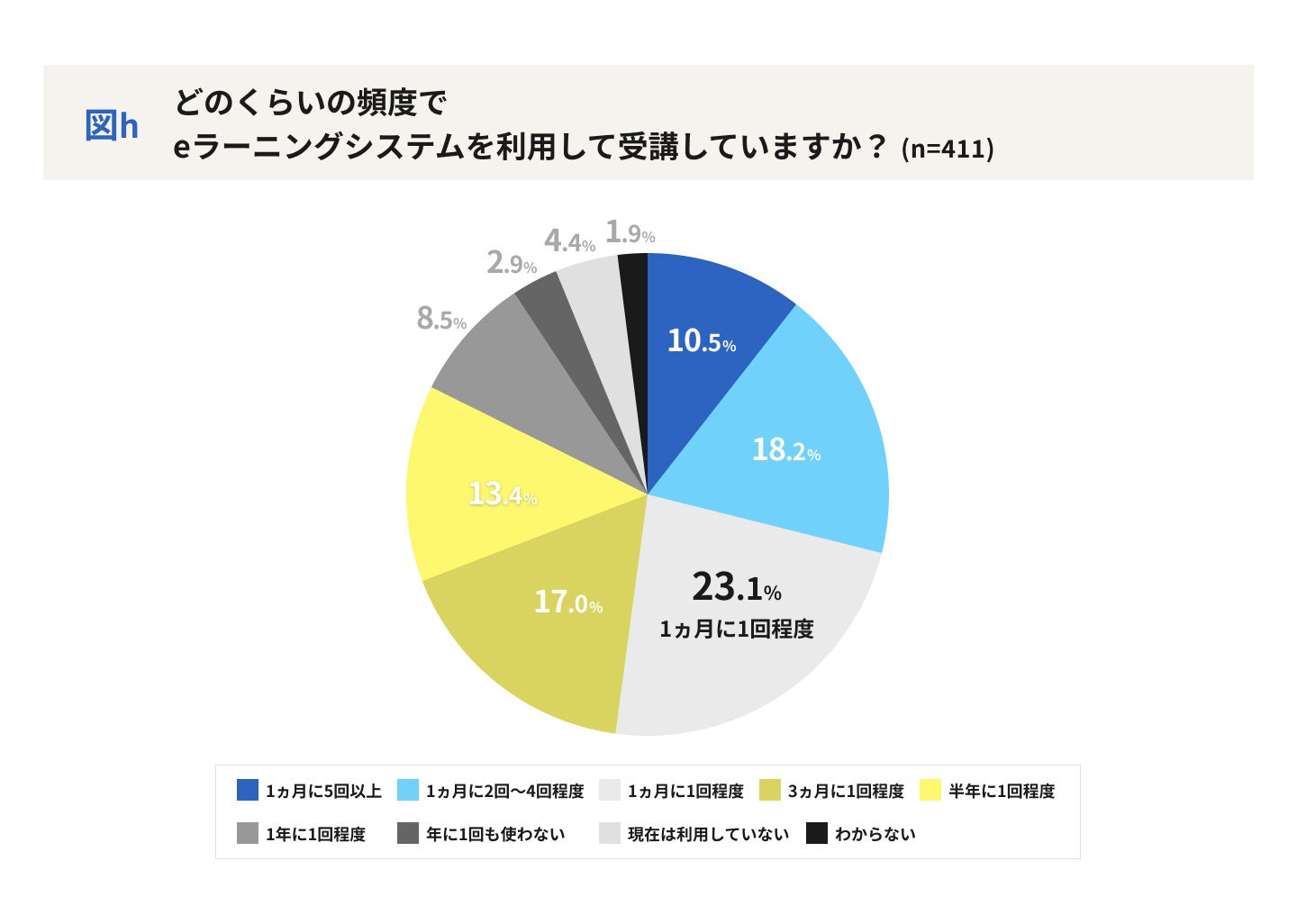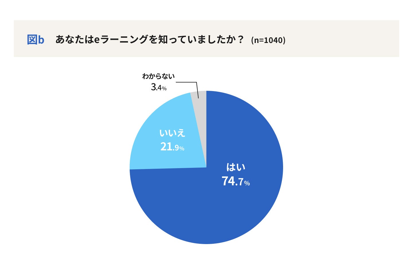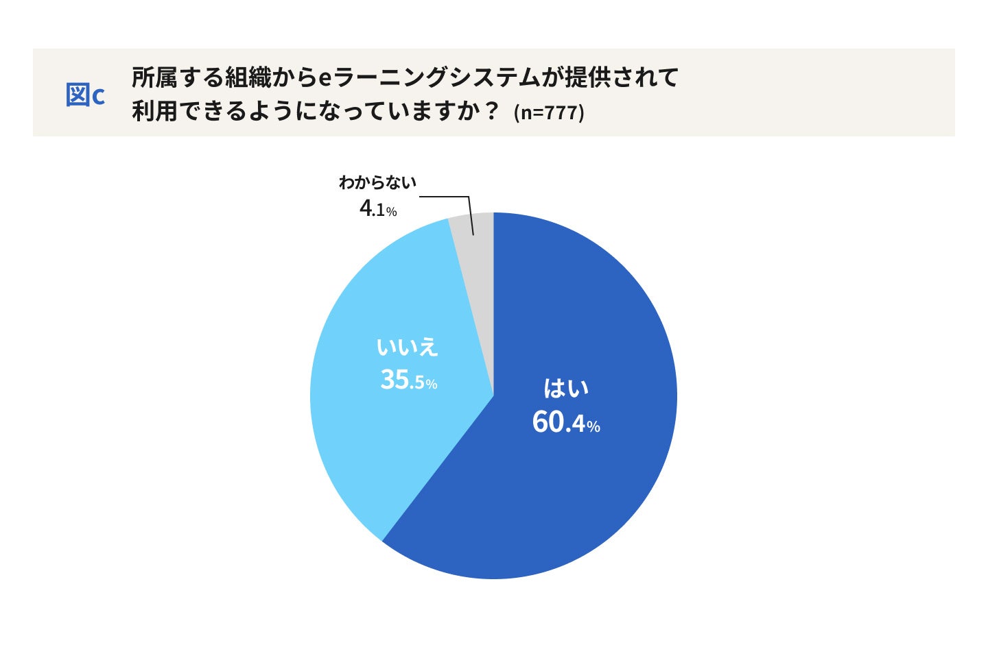 「eラーニングシステム」はオンライン学習、すなわちインターネットを活用した学習システムのことですが、そもそも「eラーニングを知っていたか」という質問について74.7%の人が「はい」と回答し、認知度が高い傾向にあることが分かりました。また、「所属する会社からeラーニングシステムが提供されて利用できるようになっている」との回答は60.4%となりました。