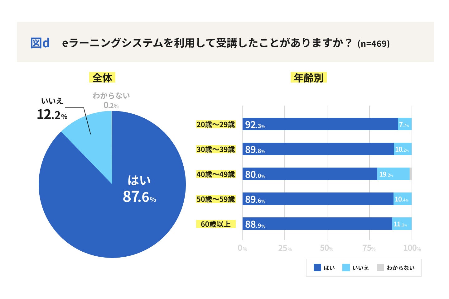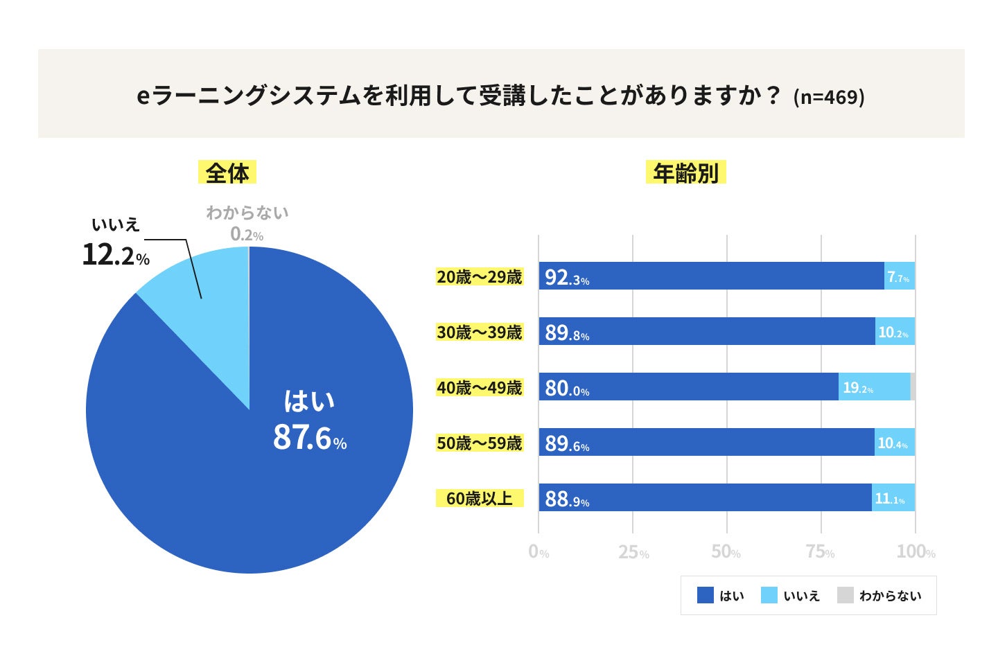 さて、そのeラーニングシステムですが、実際に利用して受講したことのある人は87.6%となりました。回答を世代別でみると、一番利用率が低い世代が40代の80%となりました。