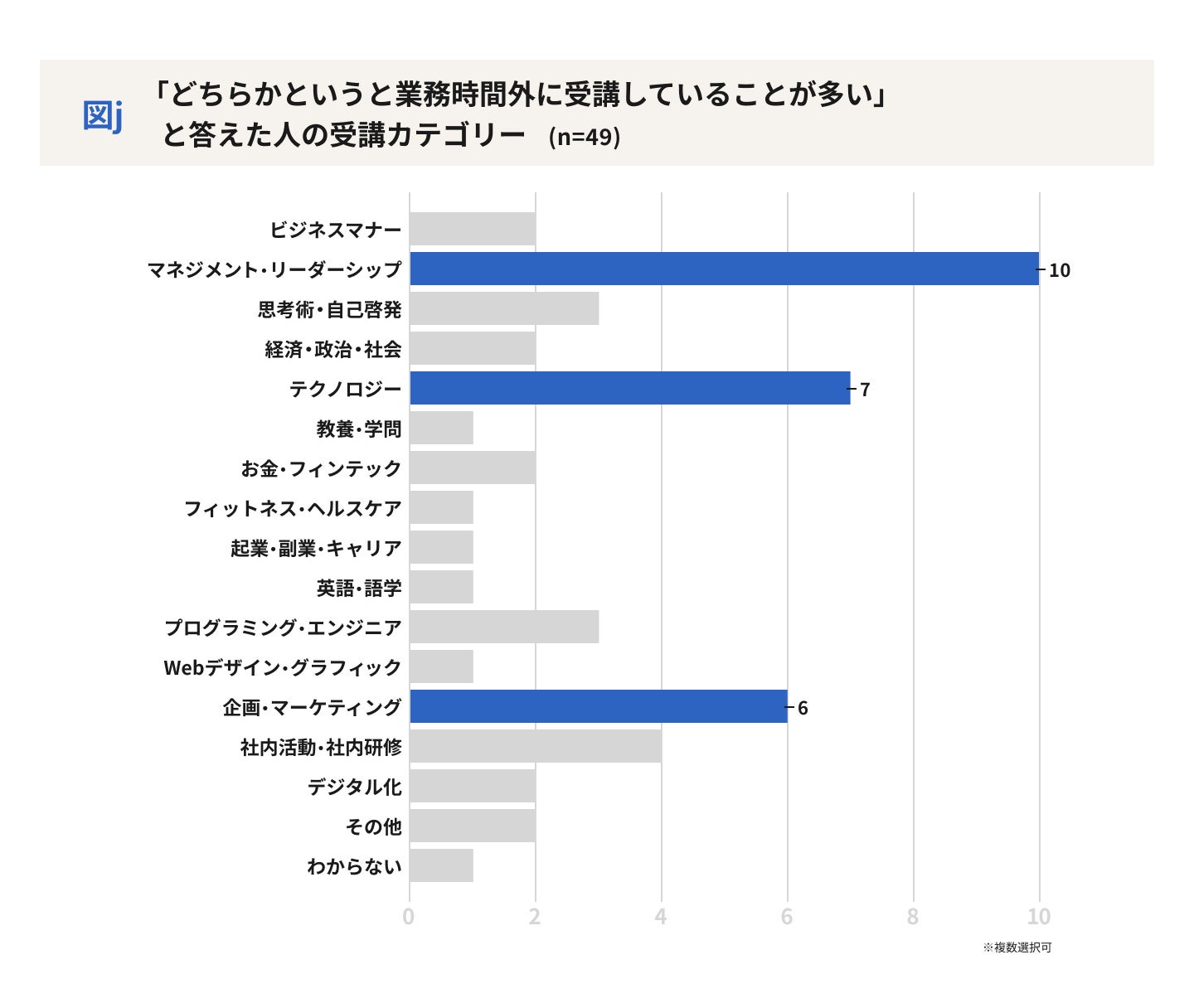 また、受講する時間帯が「どちらかというと業務時間外に受講していることが多い」との回答の中で人気のコンテンツは「マネジメント・リーダーシップ」「テクノロジー」「企画・マーケティング」となり、業務時間問わず、スキルアップに直結するコンテンツは積極的に視聴したいという関心度がわかる結果となりました。