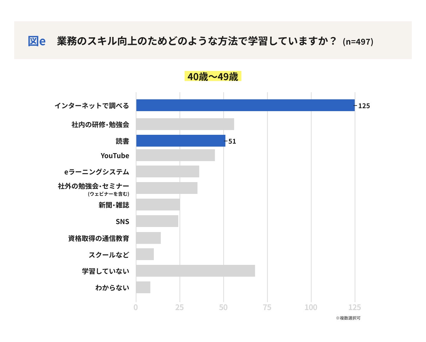 40代の学び方では「インターネットで調べる」が第1位となった一方で、「読書」が全体の平均回答より上位の第3位となり、より確実な情報源を重視していることがわかる結果となりました。