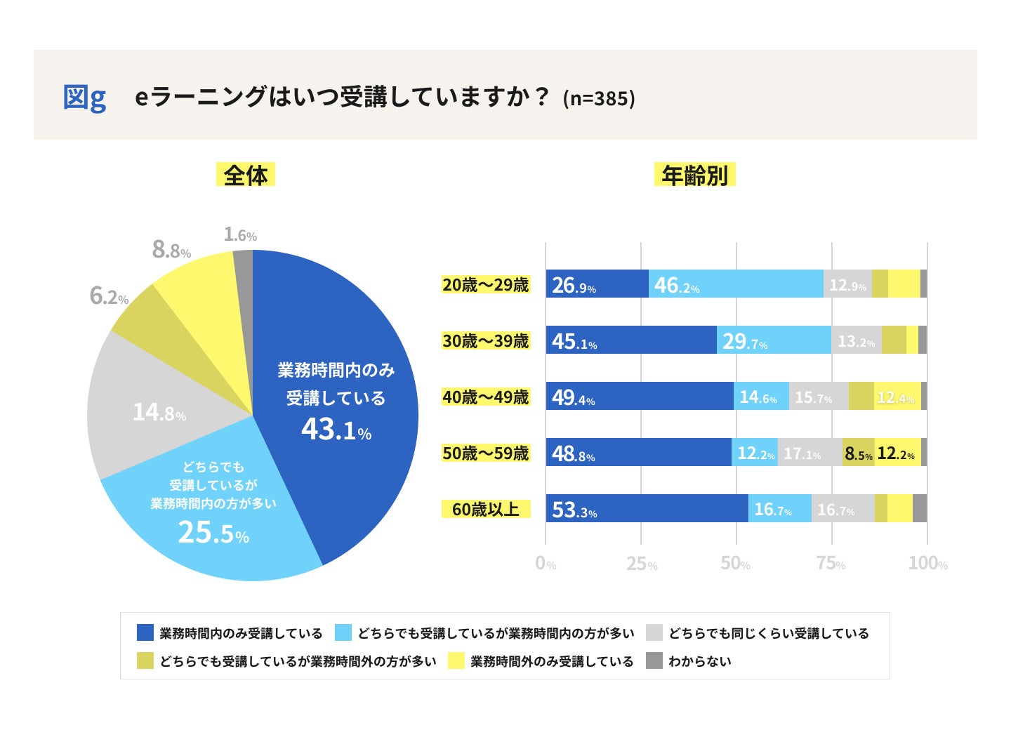 一方で世代別にみると、50代では「業務時間外のみ受講している」「どちらでも受講しているが業務時間外の方が多い」との回答が合わせて全世代で一番多く、約2割に達しました。社会人経験を重ねているからこそ、業務時間に縛られることなく、積極的に活用している姿が覗える結果となりました。
