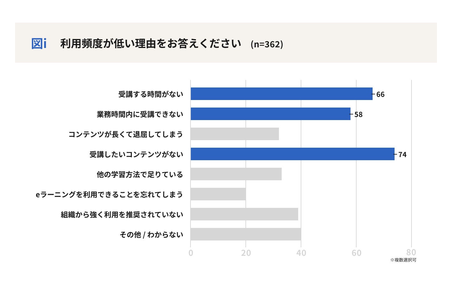 また、利用頻度が3カ月に1回以下の回答者を対象に、利用頻度が低い理由を尋ねたところ、第一位「受講したいコンテンツがない」、第二位「受講する時間がない」、第三位「業務時間内に受講できない」との回答になり、「忙しい業務時間内でも活用できるコンテンツ」が求められていることがわかりました。
