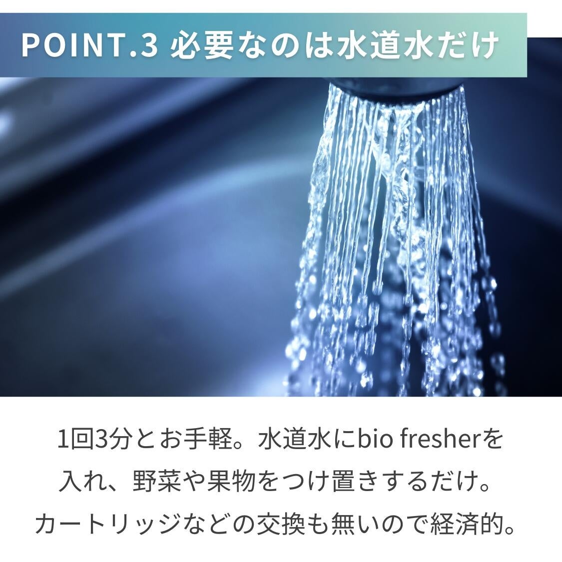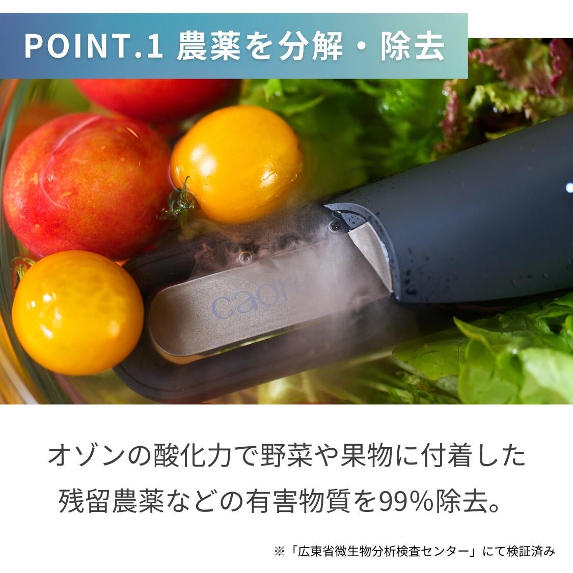 「cadre bio fresher」は1回たったの3分でフルーツや野菜、子供のおもちゃや哺乳瓶まで除菌・洗浄可能なコードレス食品洗浄器です。水道水と電気だけで高濃度オゾン水を発生させ、果物や野菜の残留農薬、大腸菌、ブドウ球菌を除去します。また、微生物の量を減らすため、フルーツや野菜の鮮度維持にも役立ちます。