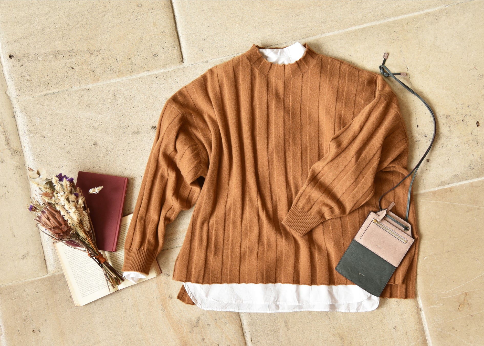 こっくりとしたキャメルカラーのワイドリブニット。身体が泳ぐようなたっぷりとした身幅と肌に触れるカシミヤの心地よさ。裾の軽さが風に舞うようにゆらぎます。ワイドリブの凹凸がキャメルカラーに陰影を与えてくれます。
