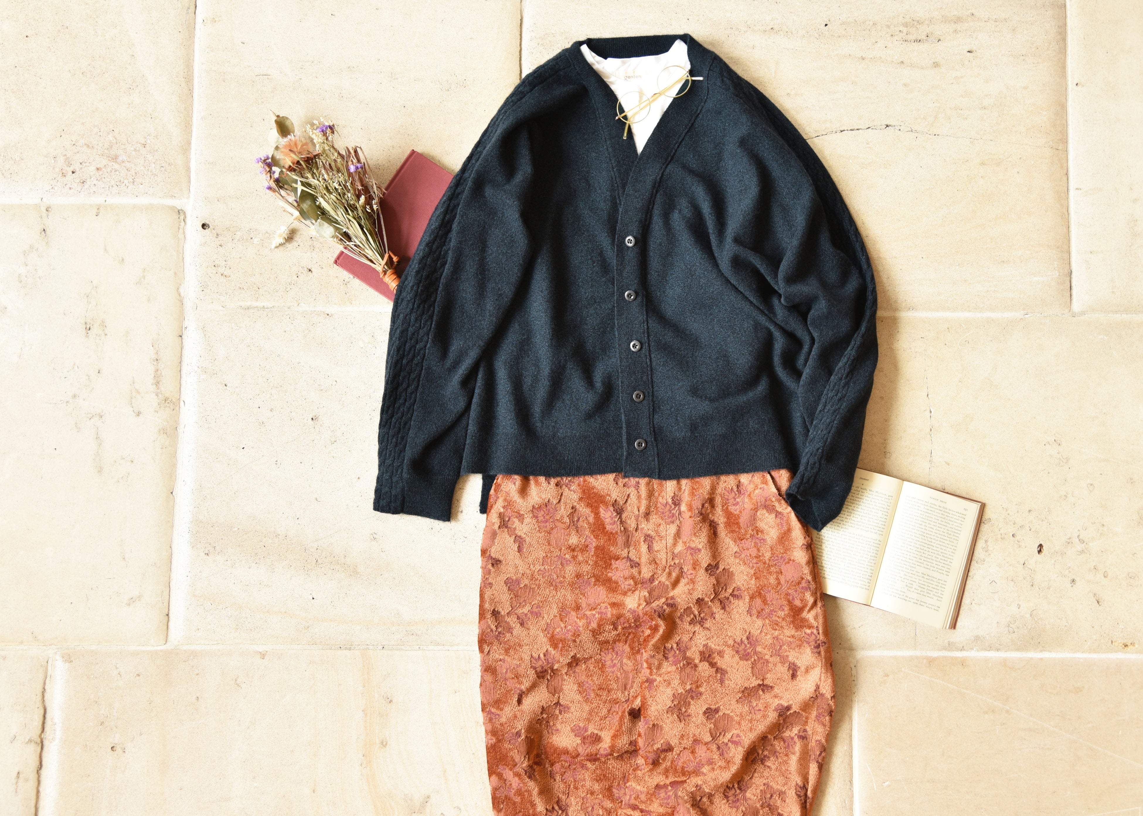 しっかりとした肉感を出しつつ軽やかさを持ち合わせたカシミヤ混の糸の2色を引き揃えて編む事で、深みのある色を表現しています。こげ茶と相性の良いブルーのコーディネートにはウオッシュしたデニムのワンピースで、こなれた印象に。