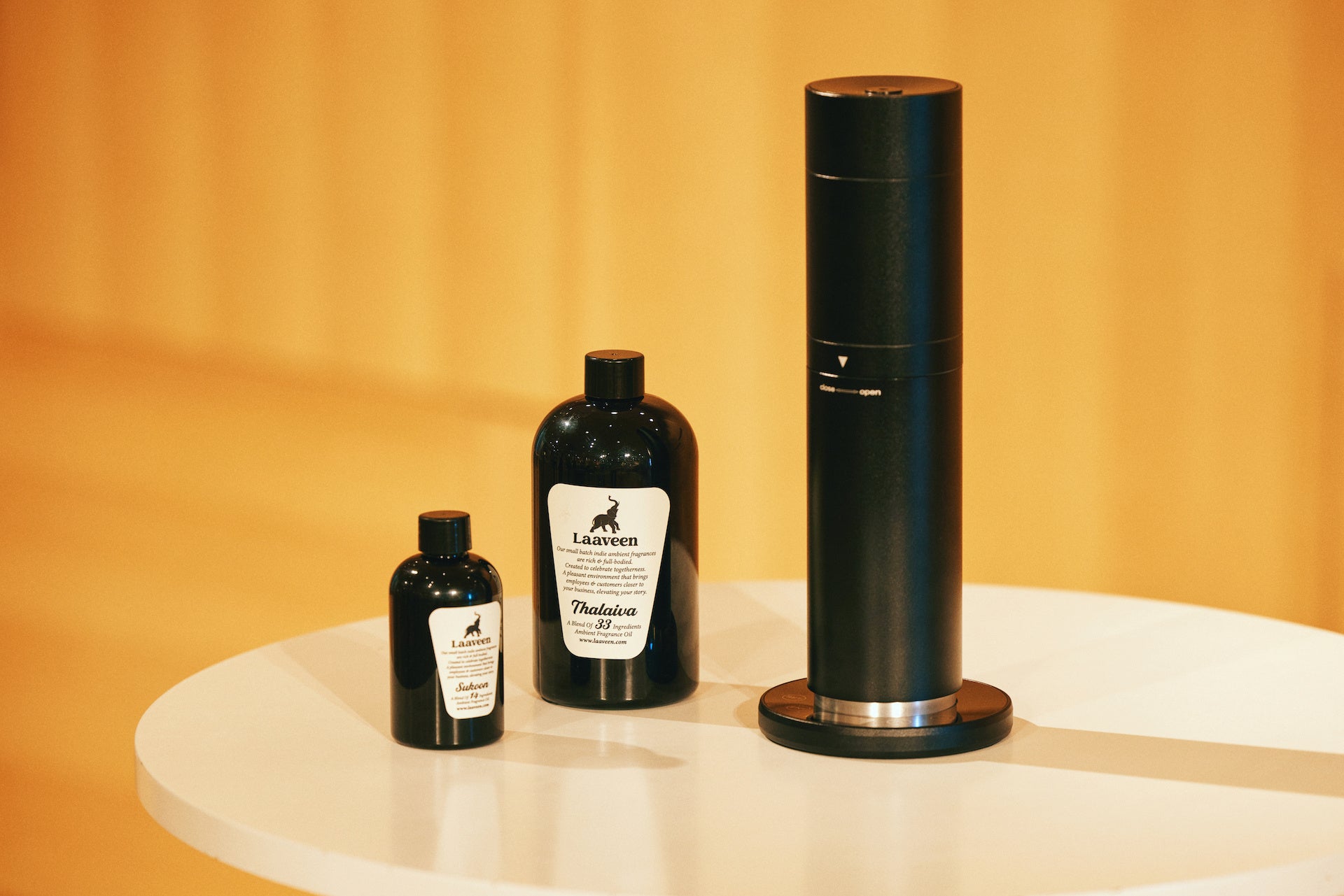 ① 家庭用のディフューザーと異なり噴霧される香りの粒子が細かく、ポンプ能力も高いため空間全体が優しく香ります。どこにいても快適に香りを感じられると同時に、長時間そばに荷物を置き続けない限り、におい移りの心配が少ないことも特徴です。