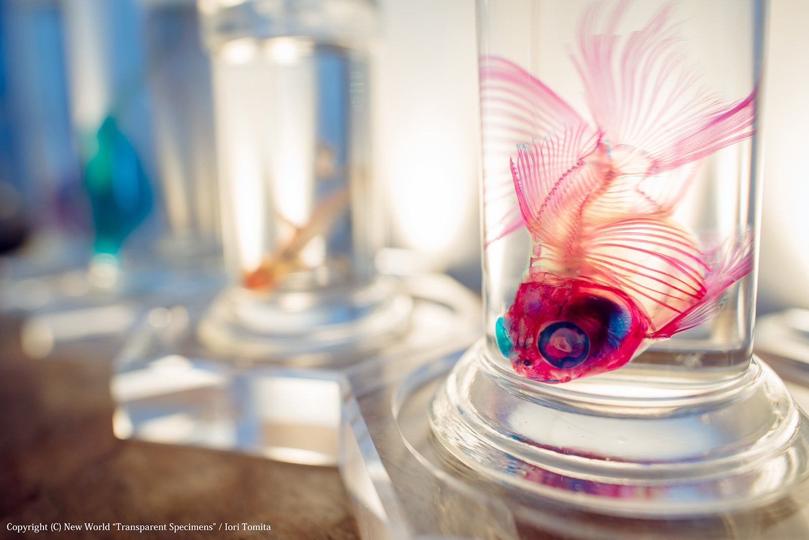冨田伊織(1983‒)は北里大学水産学部在学中に研究用の透明骨格標本に魅せられたことから独自に制作を始め、2008年に透明標本作家として活動を開始します。タンパク質を酵素で分解し肉質を透明、硬骨を赤紫、軟骨を青色に染色する骨格研究の手法をもとに、冨田による卓越した技術によって芸術的表現まで高められた『透明標本』。その世界が生み出す生命の内なる美をご体感ください。