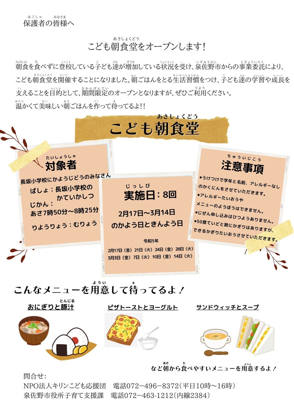 泉佐野市の事業委託による「こども朝食堂」、2023年2⽉17⽇から開催