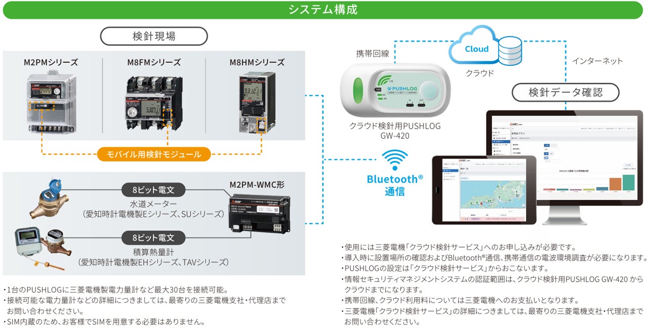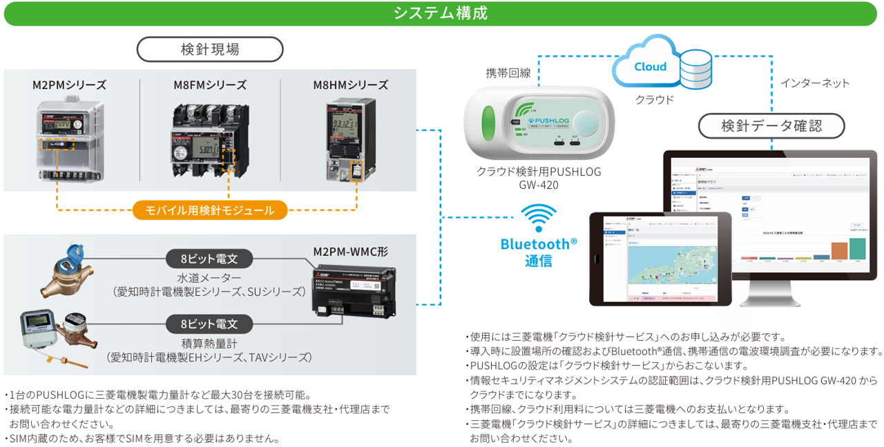 本製品は、三菱電機製モバイル用検針モジュール対応電力量計とBluetoothで無線接続、携帯回線を使用して検針データをクラウドに送信します。PUSHLOGの設定、データ確認は三菱電機製クラウド検針サービスから一元的に行うことができます。PUSHLOG本体には携帯回線用SIMを内蔵しているため個別にSIMの契約を行う必要がなく、クラウド検針サービスの月額料金をお支払いいただくだけで使用することができます。