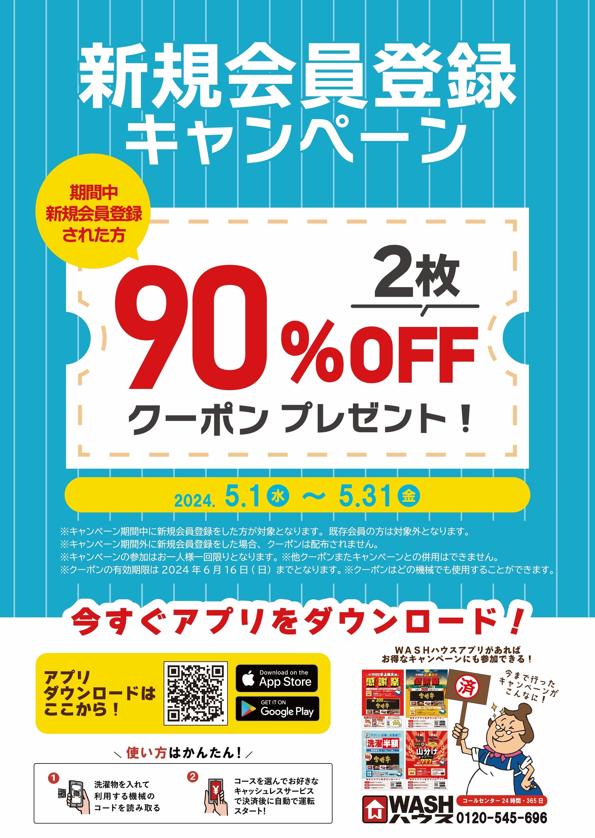 上記期間中、WASHハウスアプリの新規会員登録をされた方限定で、90%OFFクーポンを2枚プレゼントいたします。この機会にWASHハウスアプリをダウンロードして、店舗をご利用ください。