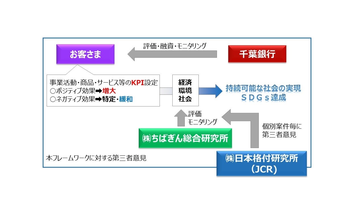 融資検討時の評価は千葉銀行と千葉銀行のグループ会社である株式会社ちばぎん総合研究所が共同して行い、事業者のKPI(目標)設定やその進捗管理を支援します。当該評価の客観性は株式会社日本格付研究所より第三者意見※1を取得して担保します。