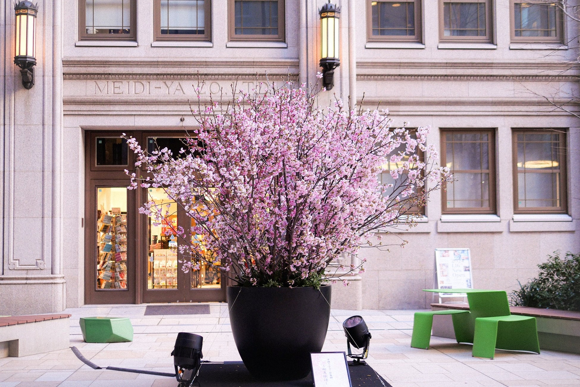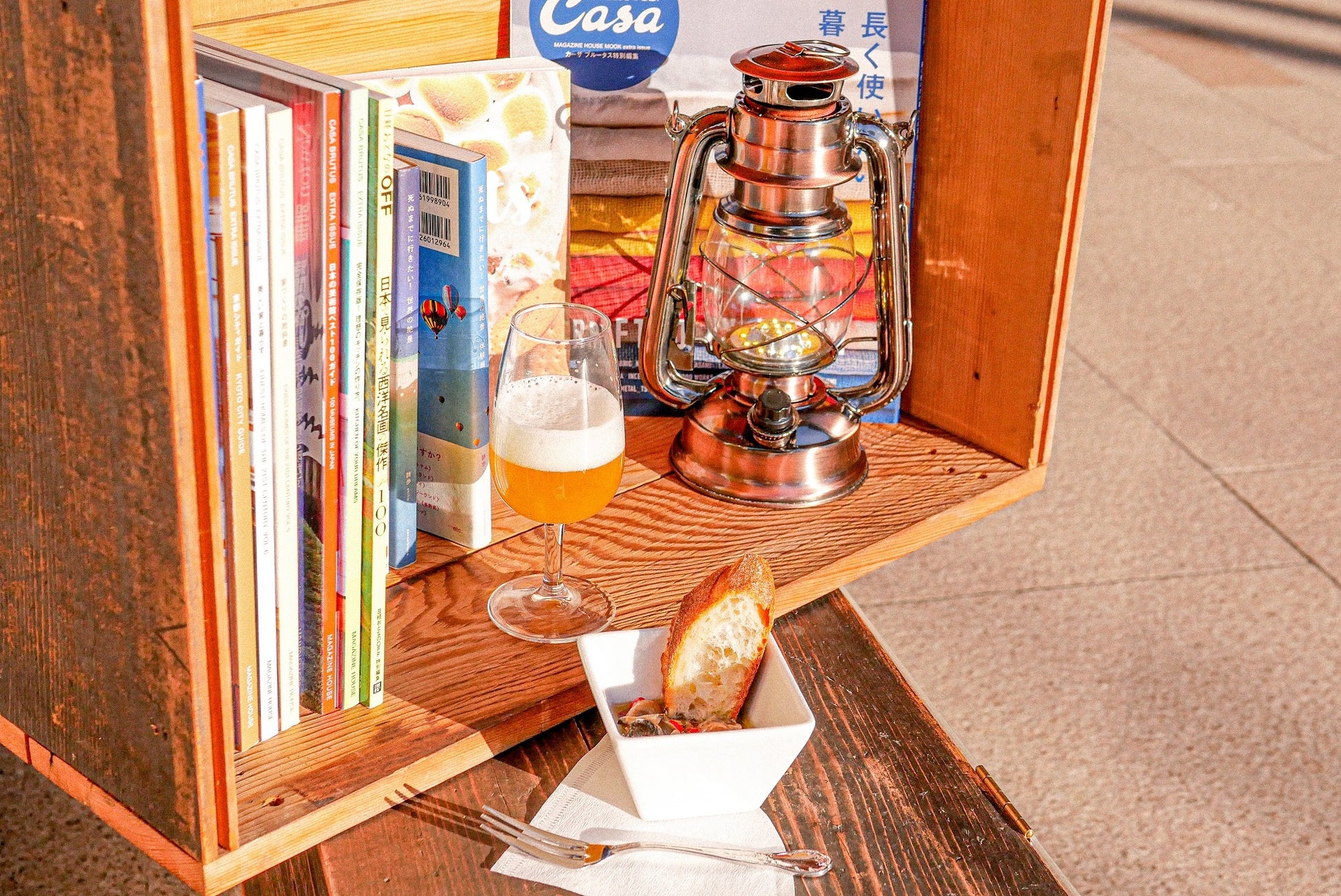 京橋のオフィス街に机や椅子としても使える「本棚」を設置します。選書のテーマは「眺める本」。銀河高原ビールのスタッフが「銀河高原ビール 小麦のビール」を飲みながら読んでほしい旅行、アウトドア、宇宙、絵本などのジャンルで選書しました。お好きな書籍をご自由にお取りいただき、オリジナルメニュー・ビールとご一緒にお楽しみいただけます。また、京橋エドグラン1階京橋中央ひろば(中央通り側)には、イベント開催期間中に桜装飾が設置されています。