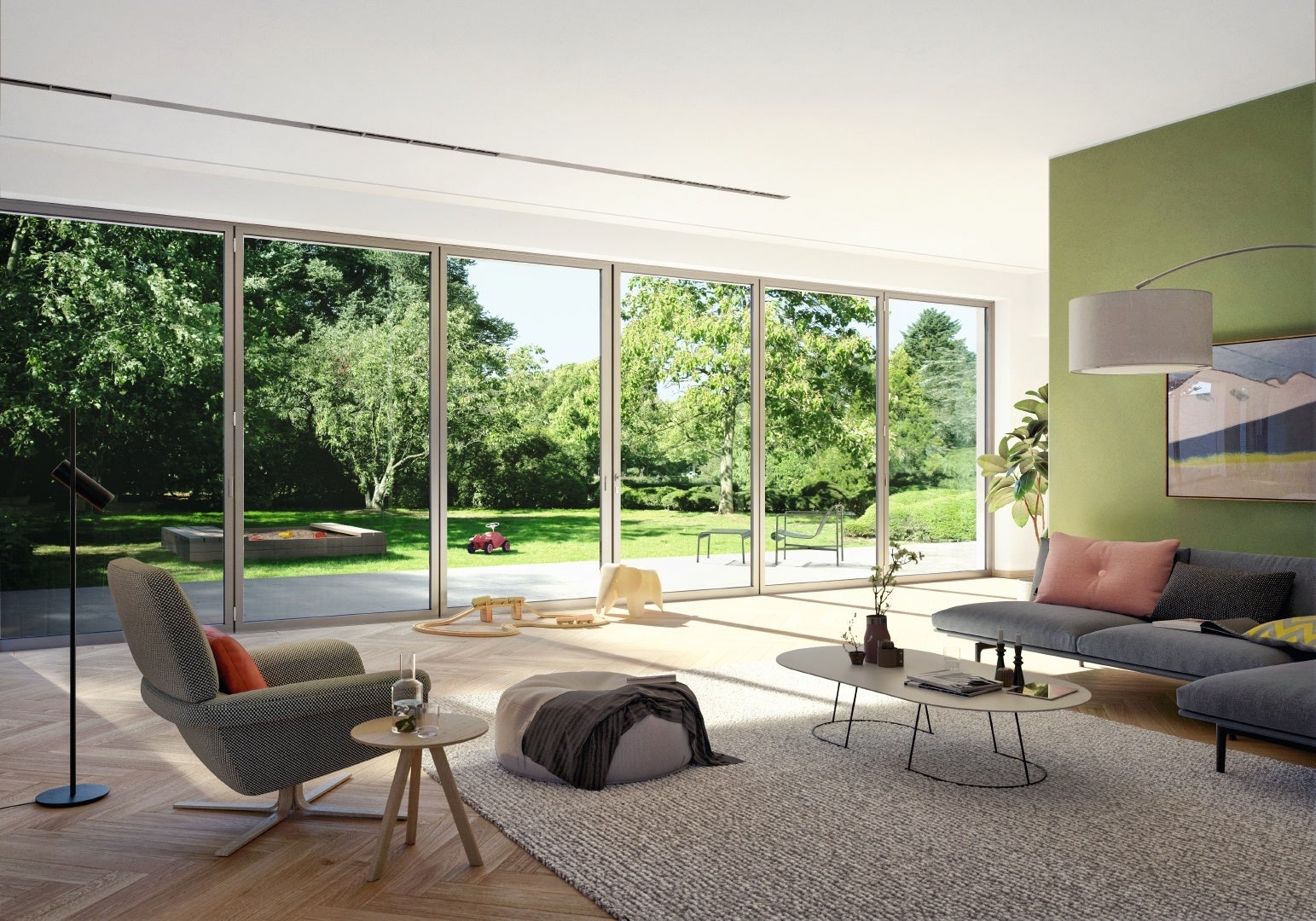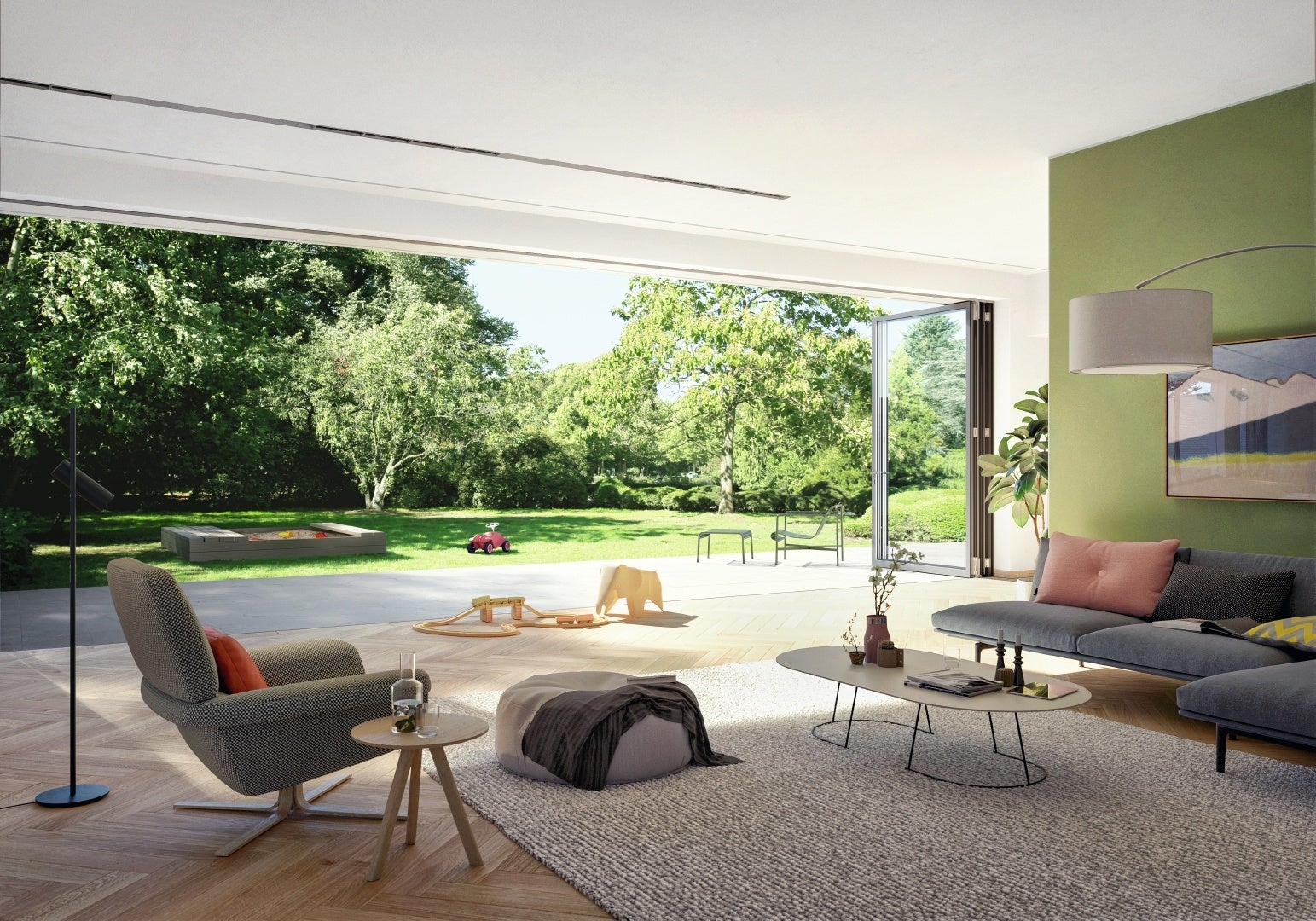 最大高さ3.5mの大開口と90mmのスリムな形材で、閉じた状態でもシームレスな眺望を実現