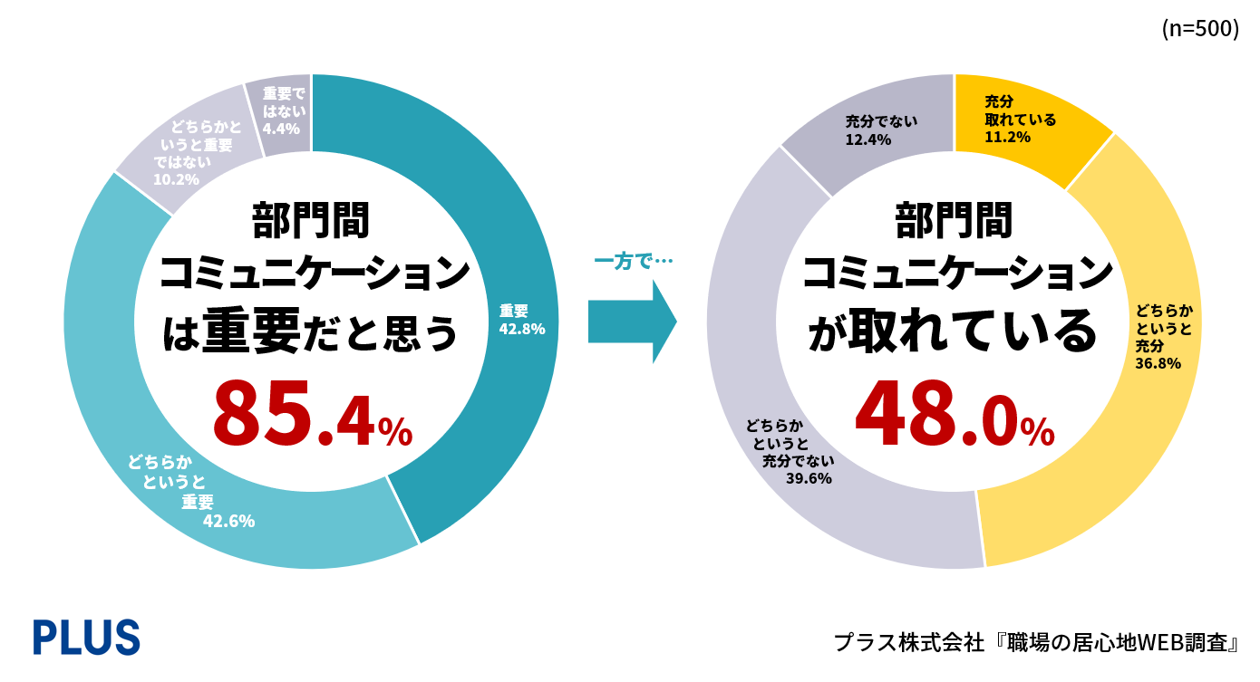 日頃からの「部門間コミュニケーション」が重要だと思う人は85.4%いるが、実際にできていると回答した人は48.0%に留まる。