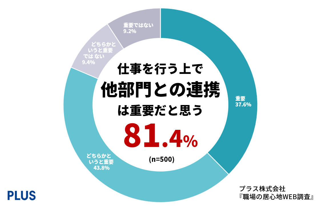 はじめに、仕事を行う上での部門間連携の重要性について質問したところ、「重要」「どちらかというと重要」の合計が81.4%と大きな割合を占めました。