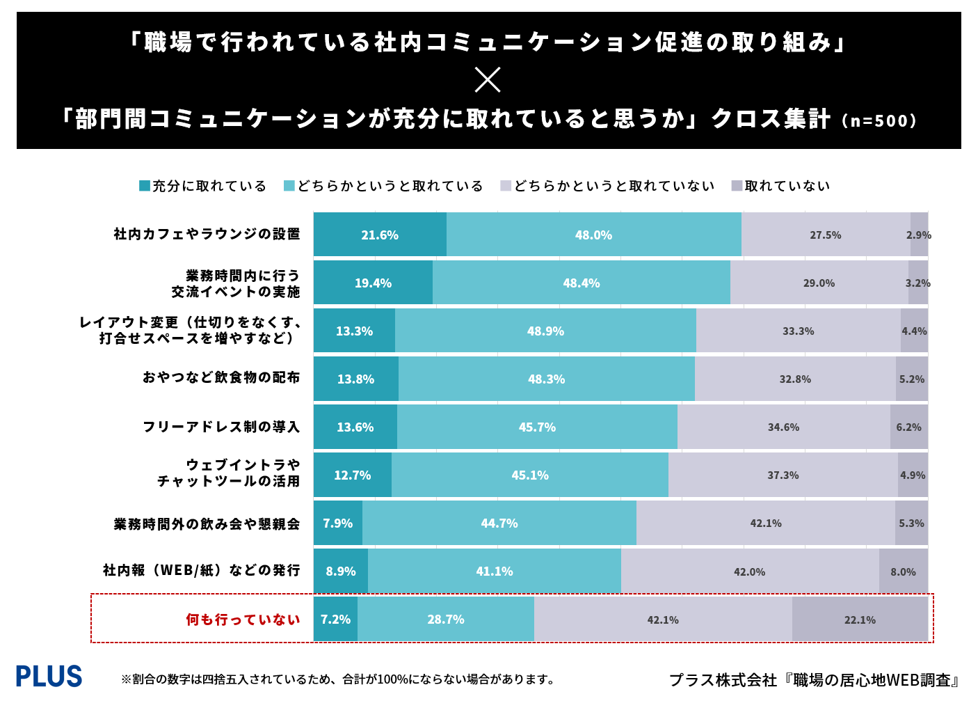 【クロス集計】「職場で行われている社内コミュニケーション促進の取り組み」×「部門間コミュニケーションが充分に取れていると思うか」