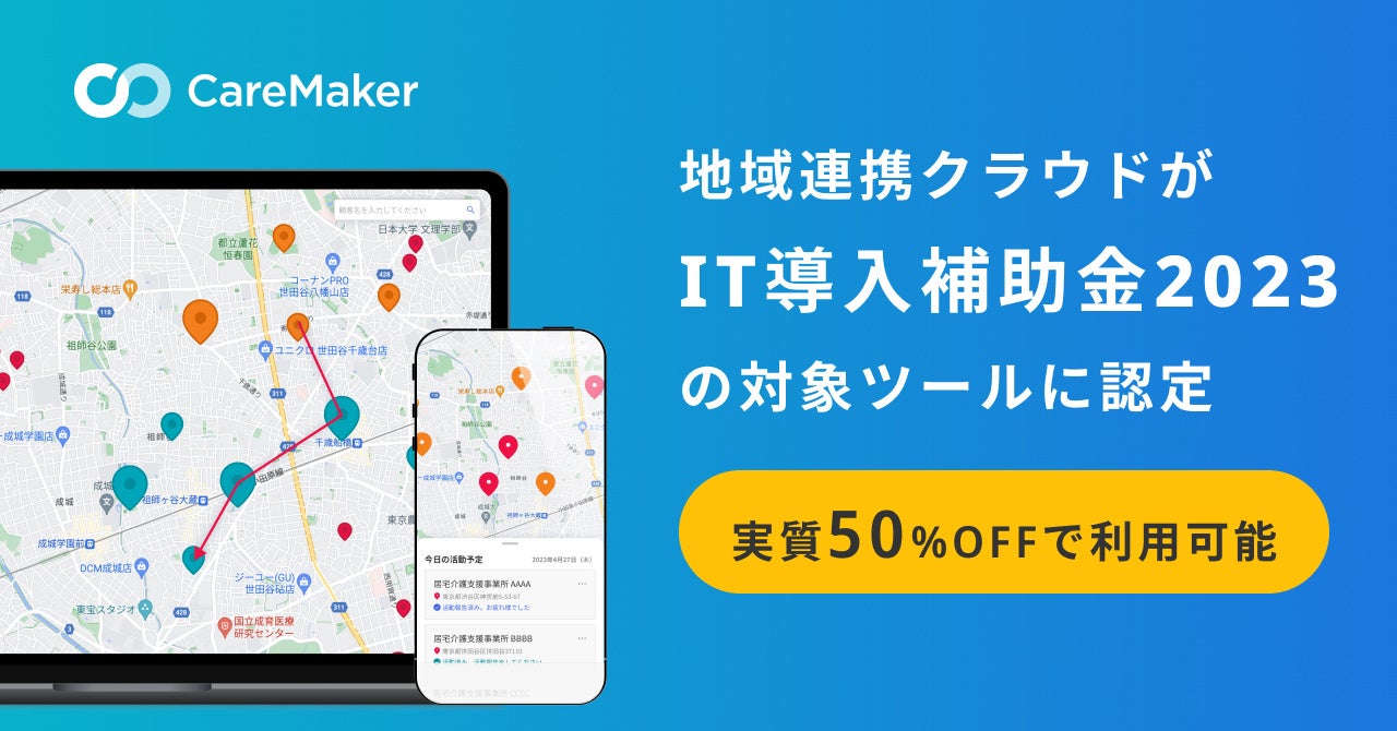 CareMakerが提供する利用者の依頼数増加を支援する「地域連携クラウド」が、「IT導入補助金2023」の対象ツールに認定されました。「地域連携クラウド」は、一定の条件を満たした対象事業者は、導入にかかる費用の1/2にあたる金額を補助金として受け取ることが可能になります。