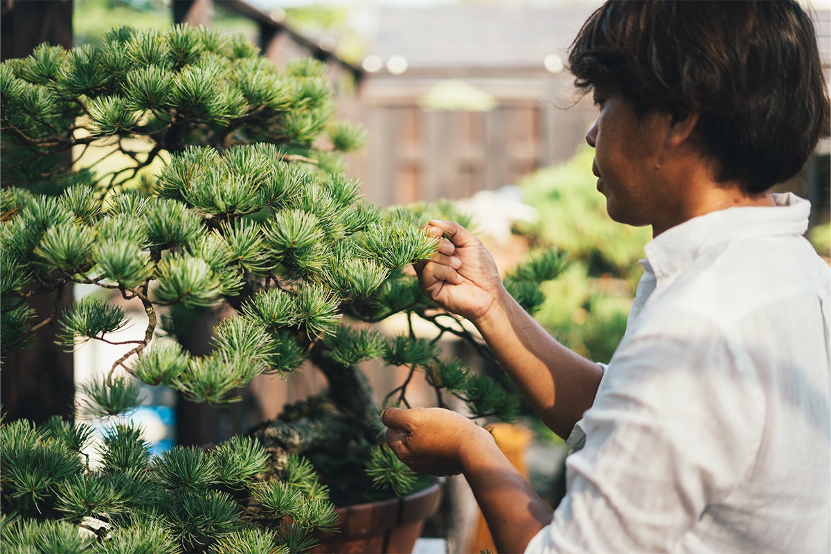 何十年、何百年、中には千年もの樹齢の木々を一鉢の中で育てていく、風雪に耐えた美しい佇まいを何世代にもわたって鑑賞できるのは盆栽ならでは。職人の技によって生み出された曲がりくねった幹や時の流れを感じさせる幹肌を、正面から、横、斜めと愛でたり、今後の成長に思いを馳せたり、盆栽と向き合う時間は育てる方にとって至福のひと時となることでしょう。