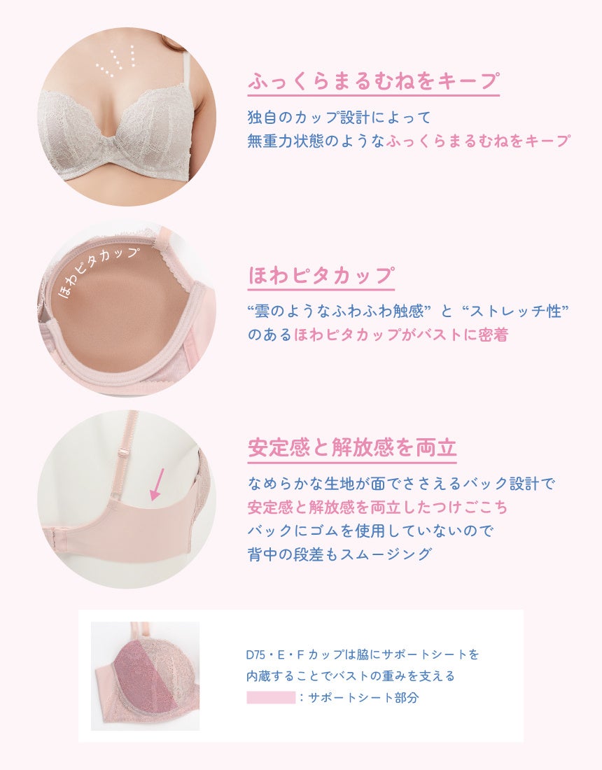 雲のようにふわふわした触感でストレッチ性が高い『ほわピタカップ』は、バストに密着することで“無重力状態”のバストをメイクし、ふっくらまるむねをキープします。