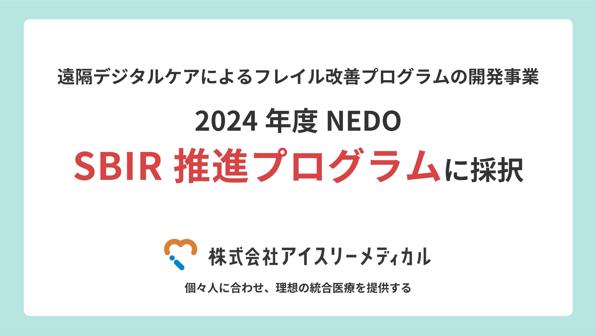 オンライン血糖値改善プログラムを提供する株式会社アイスリーメディカル(本社所在地:東京都中央区、代表取締役社長:久保田明史)は、国立研究開発法人新エネルギー・産業技術総合開発機構(以下「NEDO」)が公募した2024年度「SBIR推進プログラム」(一気通貫型)に「遠隔デジタルケアによるフレイル改善プログラムの開発および実現可能性調査」の研究テーマで採択されました(https://www.nedo.go.jp/content/100981336.pdf)。