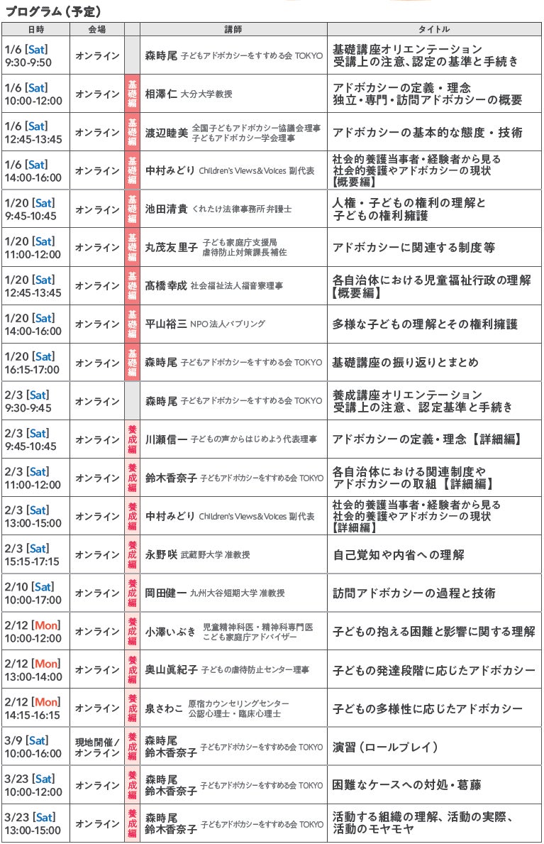 アドボケイト派遣団体や児童相談所など、各分野の専門家を招いて、子どもアドボカシーについて理解を深められる内容となっています。