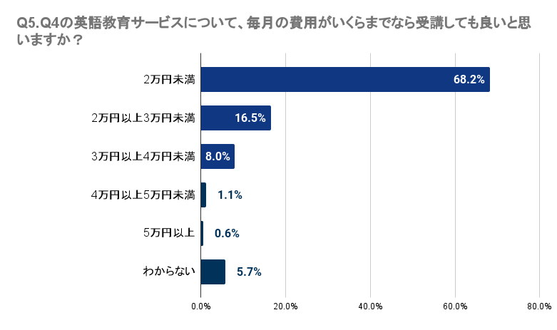 Q4で「受講したい」「料金が安ければ受講したい」「興味がある」と回答した人に、Q5で、「Q4の英語教育サービスについて、毎月の費用がいくらまでなら受講しても良いと思いますか?」と質問したところ、最も多い68.2%の回答者は2万円未満が適切と感じています。16.5%は2万円以上3万円未満、8.0%は3万円以上4万円未満と答えました。対照的に、4万円以上の費用を考える回答者は極少数で、4万円以上5万円未満が1.1%、5万円以上が0.6%でした。これにより、埼玉県では多くの人が3万円未満の価格帯を望んでいることが明らかとなりました。