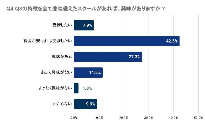 Q4で「Q3の特徴を全て兼ね備えたスクールがあれば、興味がありますか?」と質問したところ、埼玉県では7.9%が受講を希望し、42.3%は料金が手頃であれば受講したいと考えています。さらに、27.3%は興味を示していると回答しました。多くの人がこのような特徴を持つスクールに一定の興味を示していることが分かります。