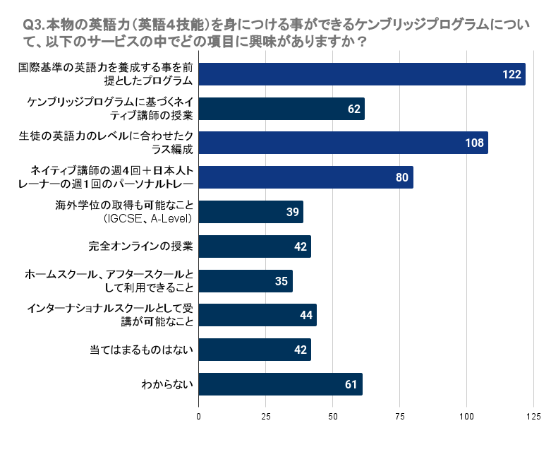 Q3で「本物の英語力(英語4技能)を身につける事ができるケンブリッジプログラムについて、以下のサービスの中でどの項目に興味がありますか?(複数回答可)」と質問したところ、埼玉県で最も多かったのは「国際基準の英語力を養成する事を前提としたプログラム」で122名でした。次いで、「生徒の英語力のレベルに合わせたクラス編成」には108名、「ネイティブ講師の週4回+日本人トレーナーの週1回のパーソナルトレーニング」には80名が興味を持っています。一方で、「海外学位の取得も可能なこと(IGCSE、A-Level)」や「ホームスクール、アフタースクールとして利用できること」に関心を持つ人はやや少なめで、それぞれ39名、35名の回答でした。これらの結果から、多くの人は実用的な英語力の養成や個別のニーズに応じた指導に重きを置いていることが伺えます。