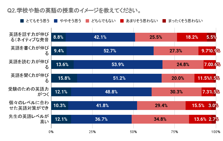 Q1・Q2では、子どもが英会話スクールや英語塾に通っていたが英語力アップの効果を感じていない人が一定数いること、学校や塾の英語の授業に対して明確な効果や良い印象を持てていない人が多いことが明らかになりました。