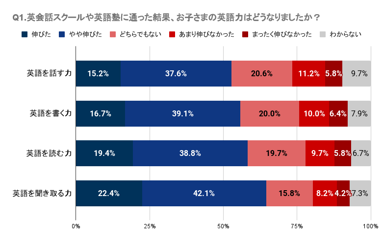 Q1で「英会話スクール、英語塾に通った結果、お子さまの英語力はどうなりましたか?」と質問したところ、埼玉県では英会話スクールや塾に通って英語のスキル向上を明確に感じられなかったと感じている人が一定数いることが分かりました。具体的には、英語を話す、書く、読む、聞き取る各スキルにおいて、「伸びた」と感じる人は約15%~22%であり、一方で「あまり伸びなかった」や「まったく伸びなかった」と回答した人が合わせて約12%〜17%となっています。特に、「英語を話す力」と「英語を書く力」においては「あまり伸びなかった」と「まったく伸びなかった」の合計がそれぞれ16.9%、16.4%となっています。また、各スキルに関して「どちらでもない」と答えた人も含めると、28%~38%となっており、明確な効果を実感していない人が一定数存在することが伺えます。