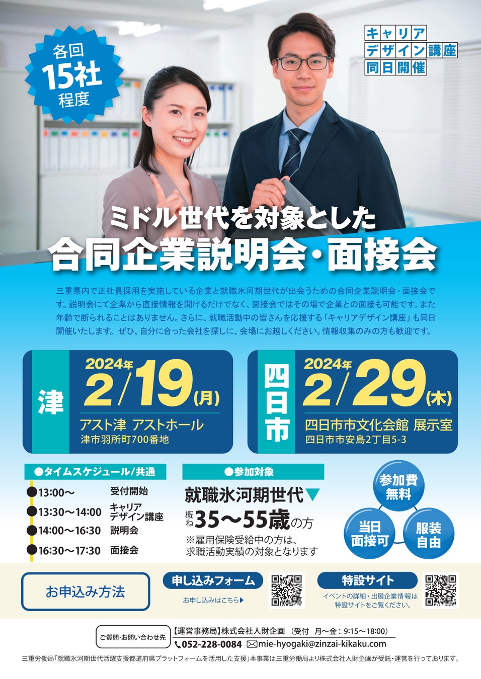 【三重労働局主催だから安心】2月19日(月)、2月29日(木)地元の企業と直接話せる!ミドル世代を対象とした合同企業説明会・面接会を開催します!