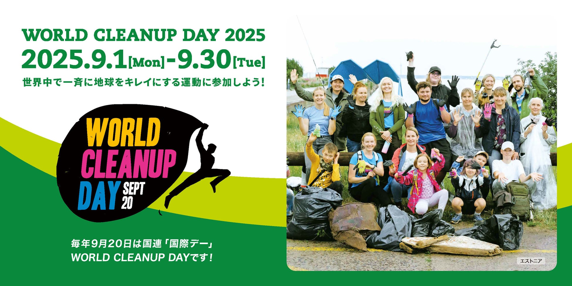 2025年9月20日(土)なお、当日実施できない団体・企業・個人は、2025年9月1日から同30日までにクリーンアップ(清掃活動)を実施することにより、WORLD CLEANUP DAY(ワールドクリーンアップデー)に参加したものとみなします。