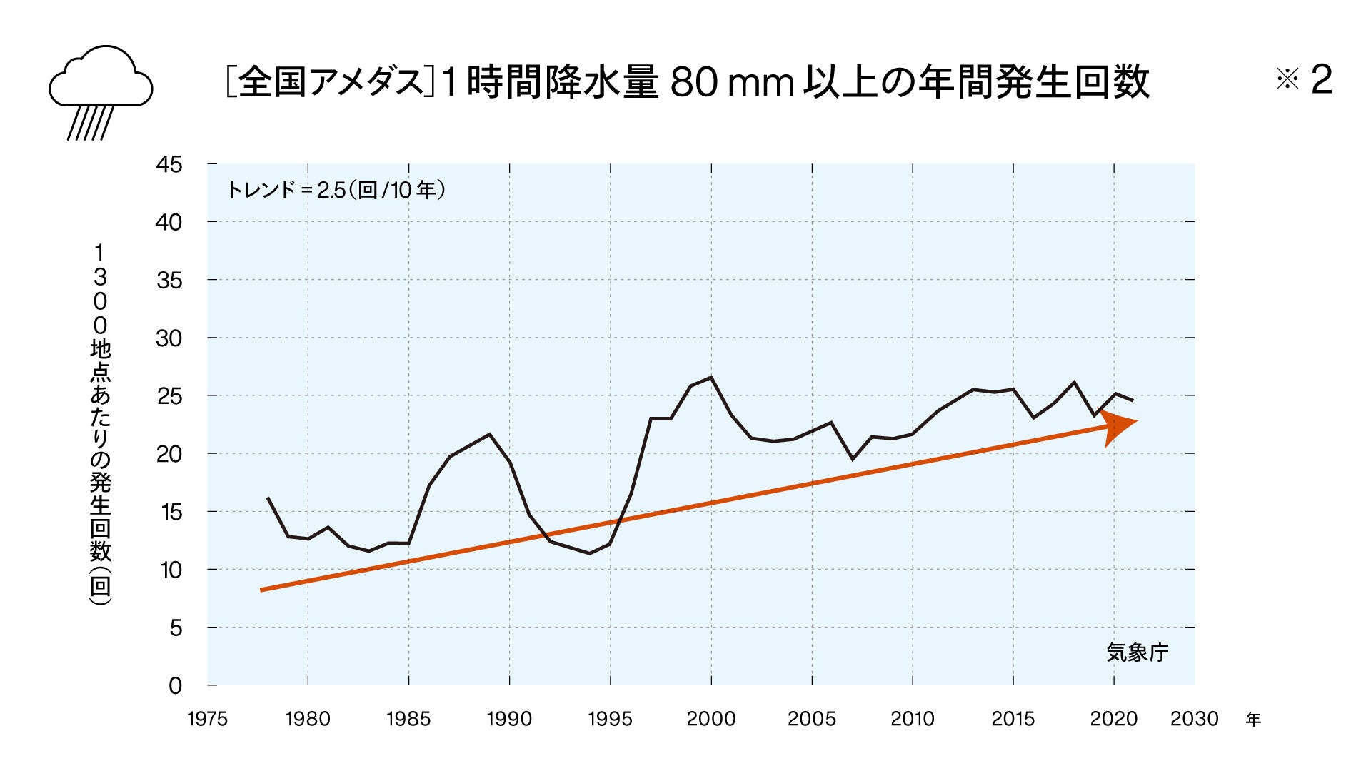 1時間降水量20~30mm未満で一般的に“どしゃ降り”といわれる中で、1時間降水量80mm以上の強い雨の年間発生回数は、1980年頃と比較して、約2倍にまで頻度が増加しています。