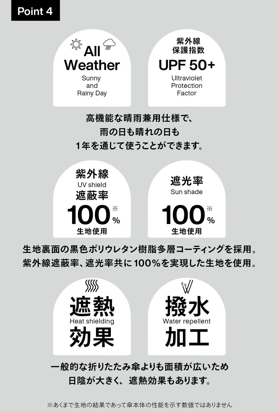 遮光率・UVカット率はともに100%、防水性能はIPX5のテスト、安全性はEUが定める基準をクリアしています。晴雨兼用で、年間を通じてこれ1本でOKです。1回約1.5時間の充電で、200回ほど開閉できます(使用頻度による)。