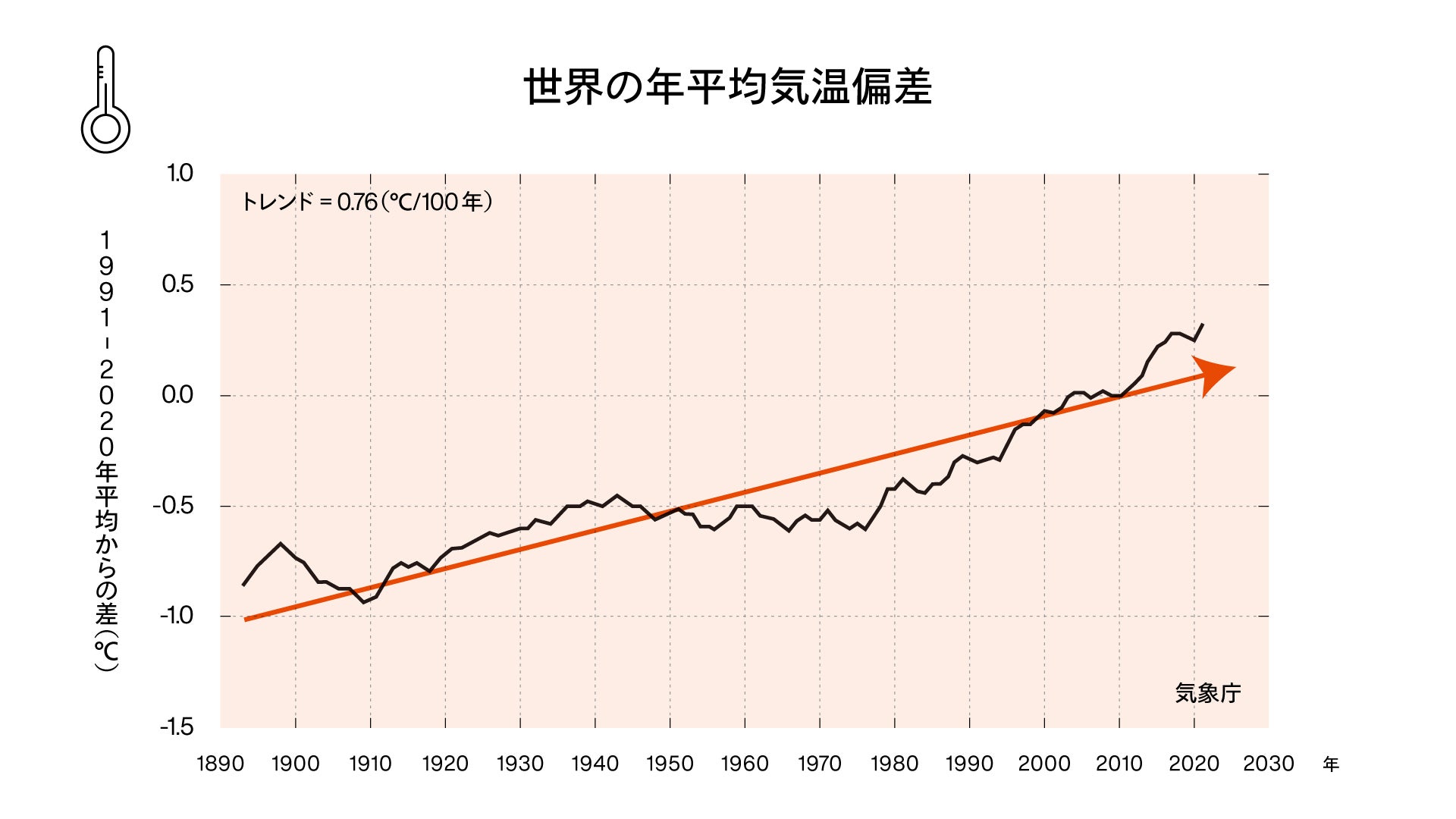 気温は年々上昇し、ゲリラ豪雨も増加傾向にある昨今。1991〜2020年の30年の平均気温に比べて、2022年は+0.60、2023年には+1.29という結果に。