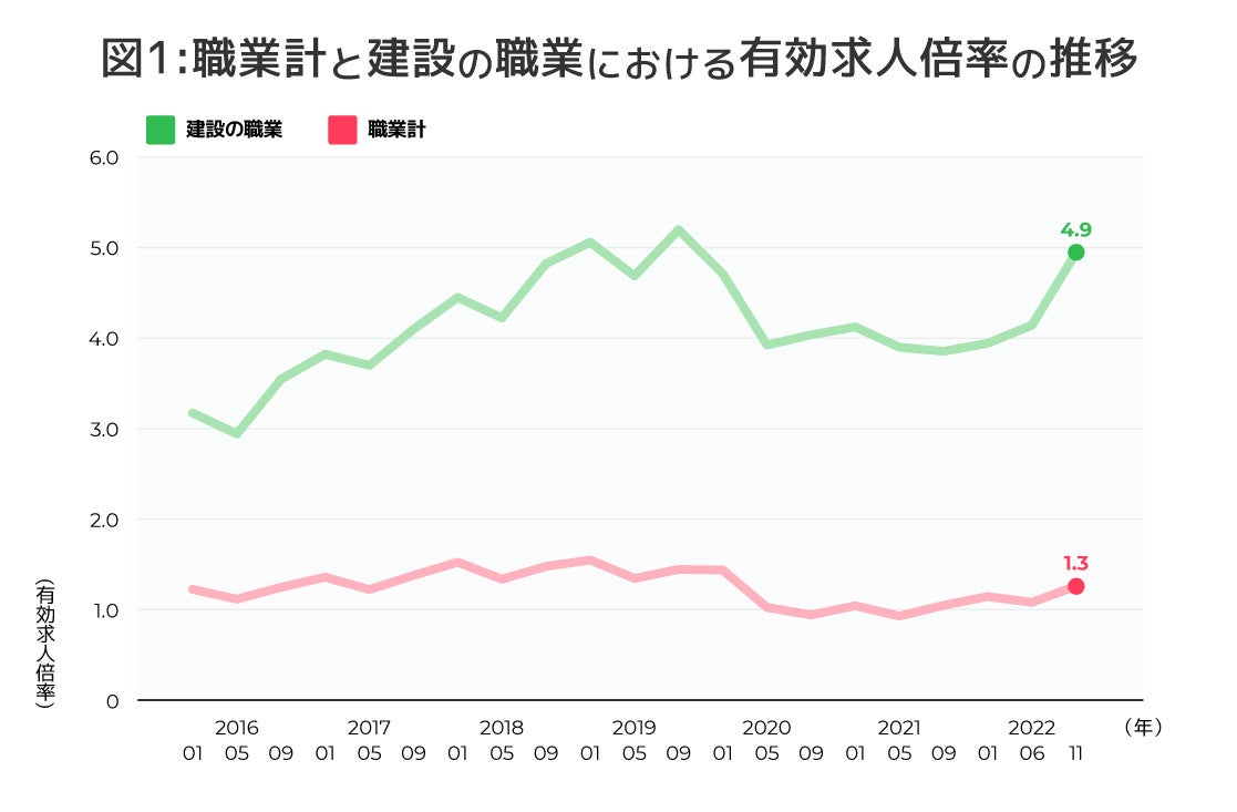 厚生労働省が発表している「一般職業紹介状況」の最新発表によると、2022年11月の建設業における有効求人倍率は4.9倍となりました。(図1)