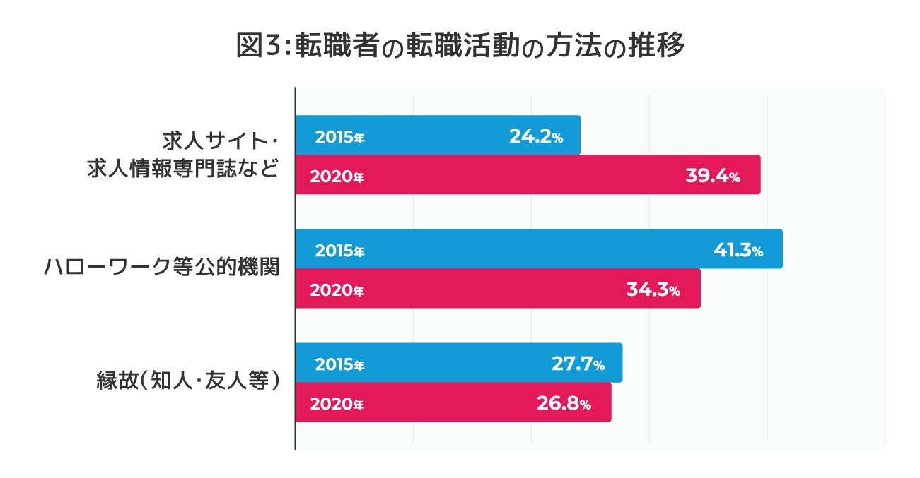 一方で求人サイトの利用率はこの5年で急増しており、2015年は24.2%のところ、2020年は39.4%となった。