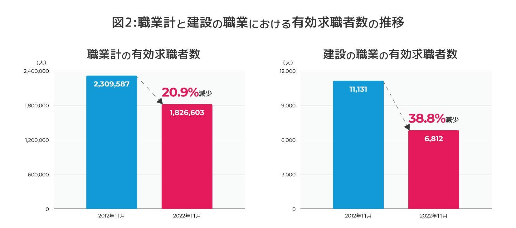 ・また、2022年11月の建設業における有効求職者数は6,812人となった。2012年11月の有効求職者数は11,131人となっており、この10年間で38.8%減少している。