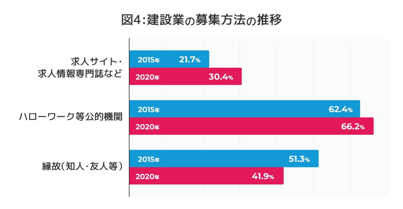 その一方で、建設業の企業はいまだハローワークを利用している割合が高い状況です。2015年は62.4%、2020年は66.2%となり、この5年間で3.8ポイント増えています。(図4)
