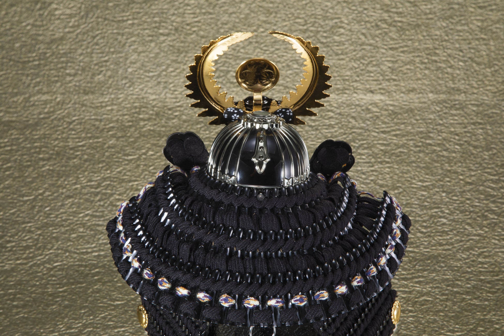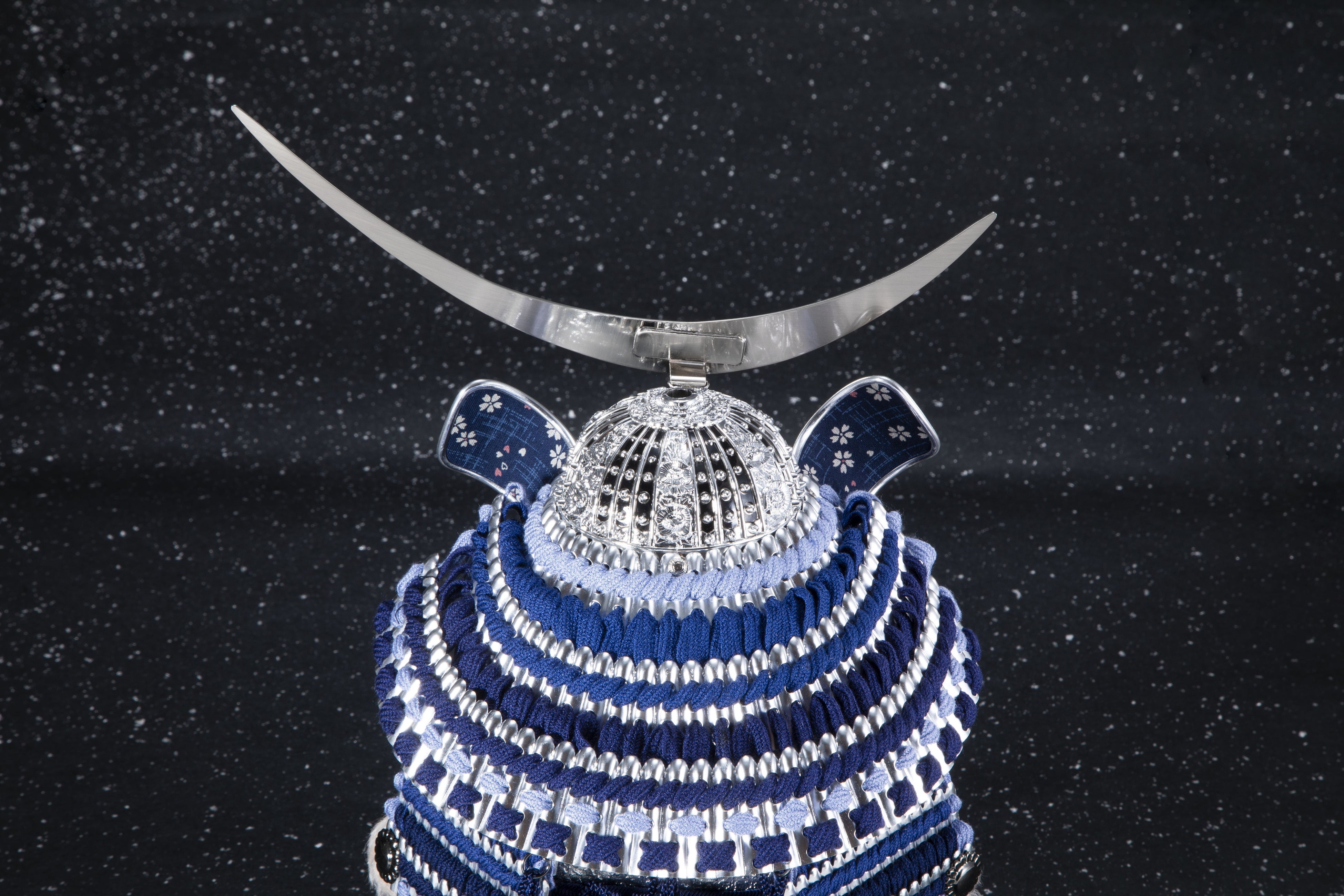 伊達政宗の三日月のデザインは、父である伊達輝宗が息子に対する期待と仏の加護を祈願して決めた、月の前立に由来しているとされます。毎年人気の三日月モデルは、爽やかなブルーを基調とした鎧に、シルバーの三日月が映えて、洗練されたシャープな印象を与えます。