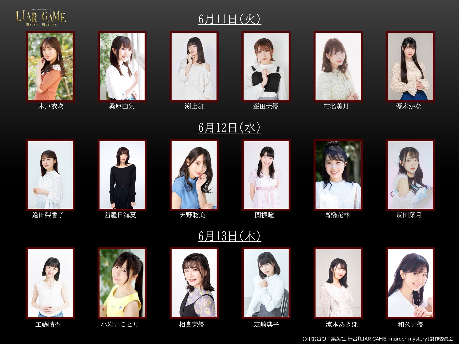 舞台版マーダーミステリーは、台本なしセリフなし、あらかじめ用意されているのは配役の設定のみ…という演出のなか、キャストが舞台上で役になりきりながら、時間内に真犯人を見つけ出すべく議論を重ね、推理を行う革新的なリアルエンターテインメントです。一度真犯人を知ってしまうと同じストーリーを二度とプレイできないため、毎日異なるキャストが出演します。公演は1日2回で、昼と夜でシナリオが異なるため、キャストは同日のうちに全く別の登場人物を演じ分けます。人気漫画『LIAR GAME』の醍醐味である賞金をめぐるプレイヤー同士のだまし合いや駆け
