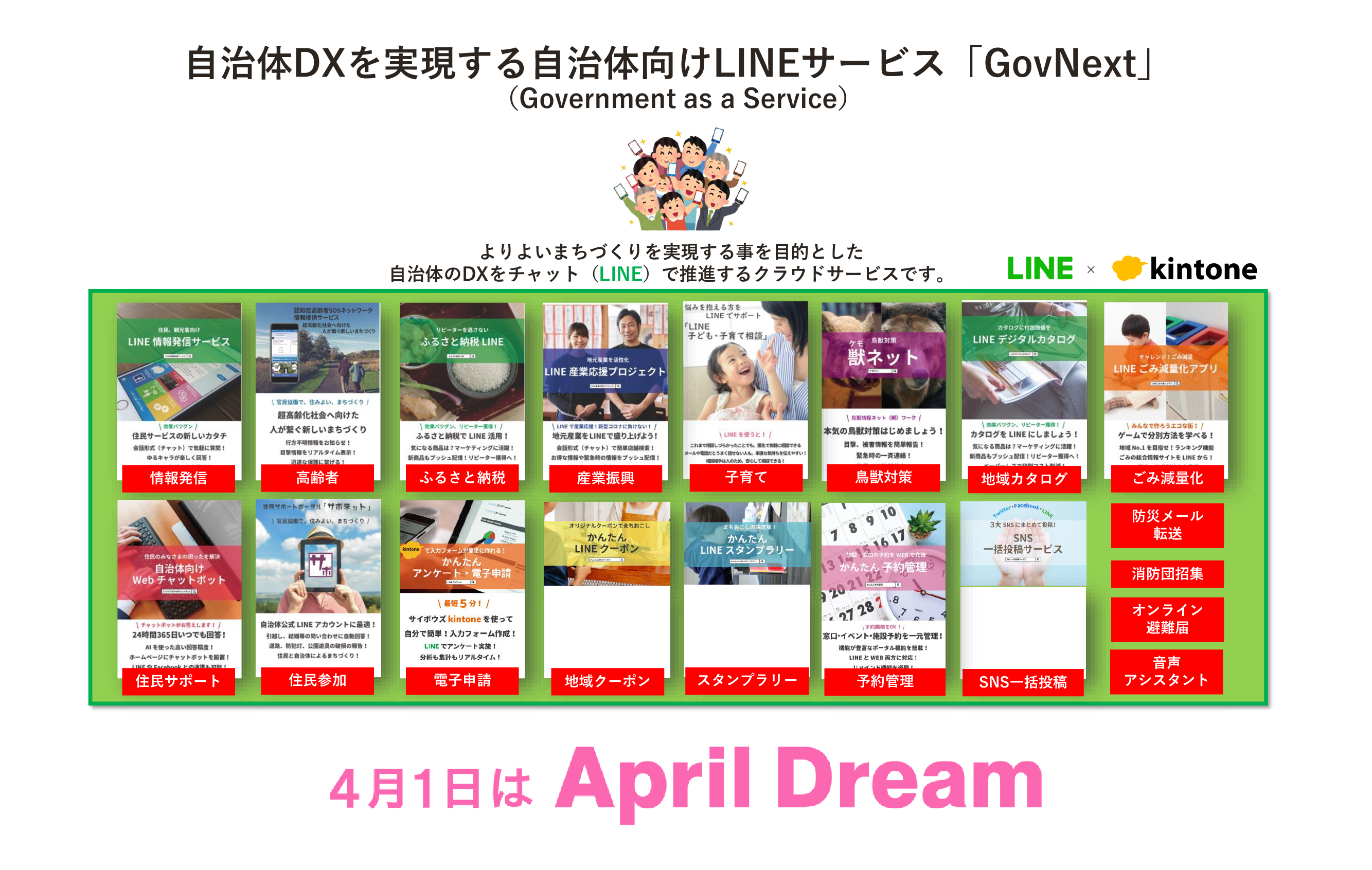 「GovNext」は、情報発信から災害対策、子ども・子育て支援、高齢者社会対策、産業振興、住民参加推進、電子申請・アンケート、鳥獣対策、ごみ減量化、スタンプラリー、地域クーポン、予約管理まで、多岐にわたる自治体のニーズに応えます。