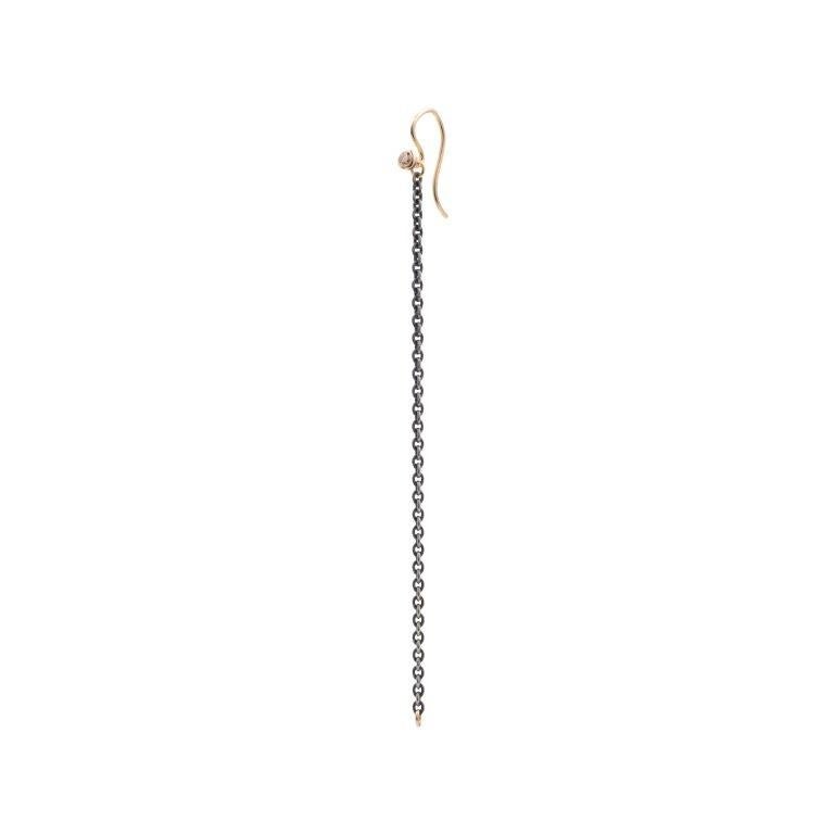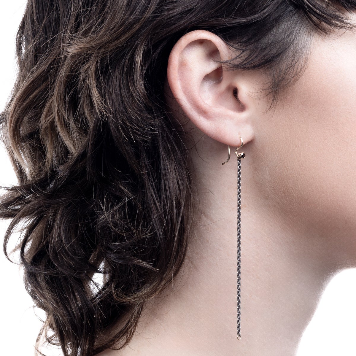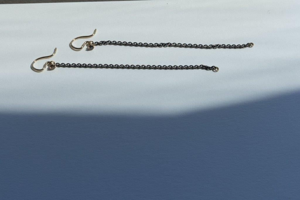 オキシダイズドされた深いブラックカラーのロングチェーンとイエローゴールドのコンビネーションでモード感をプラス。