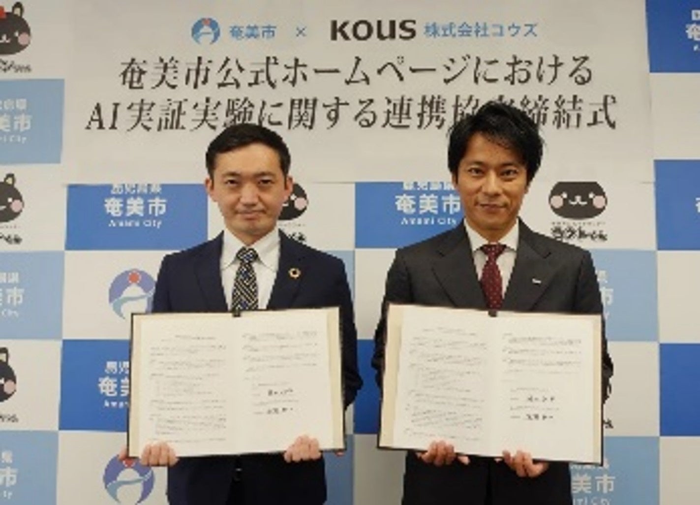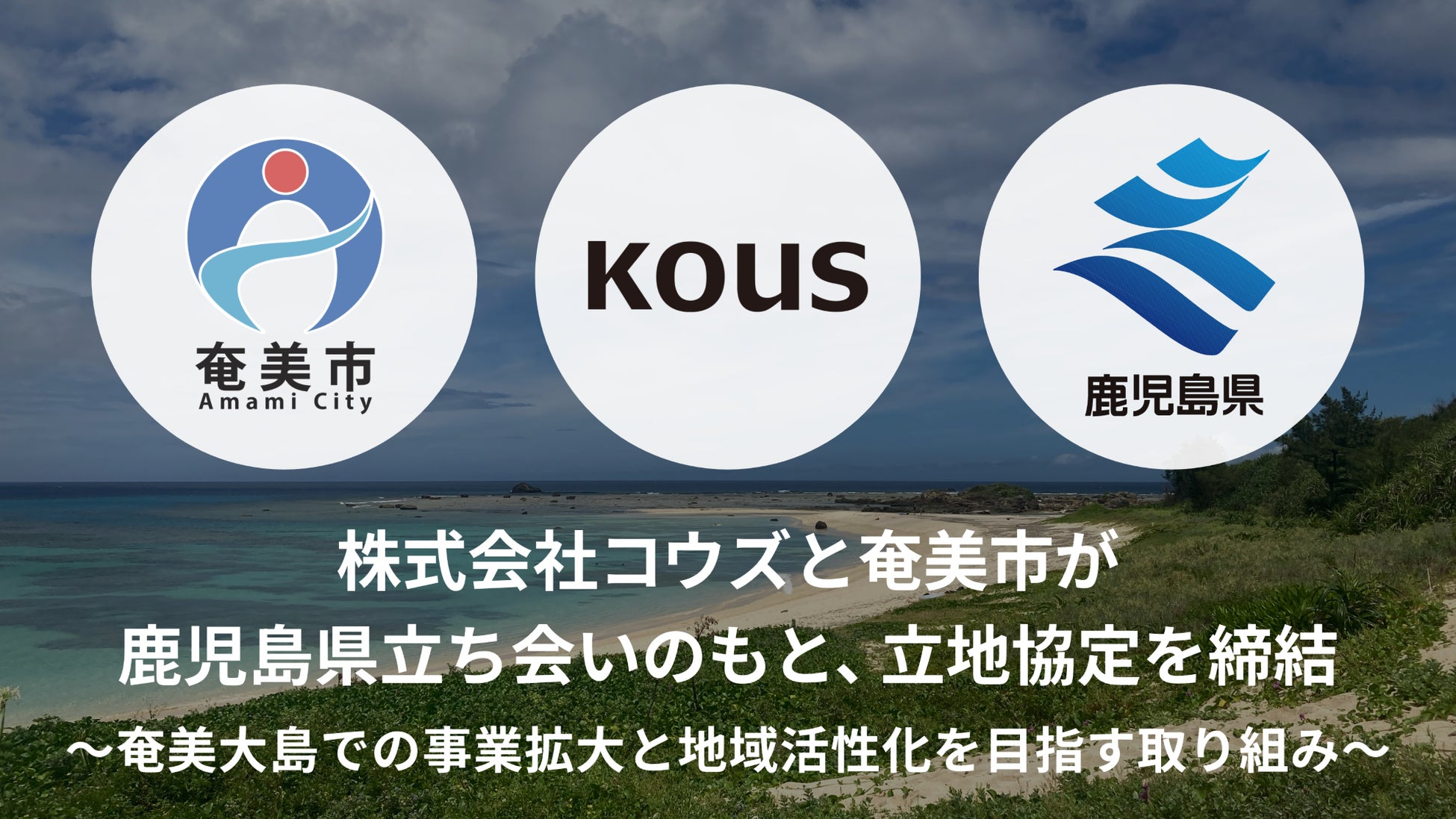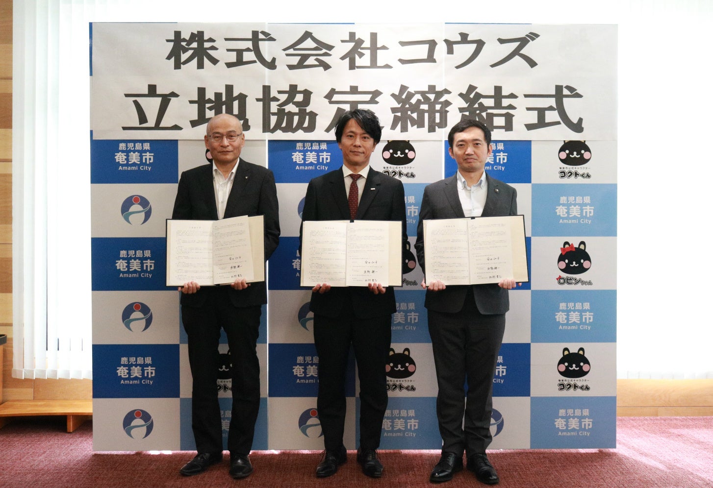 株式会社コウズ(本社:大阪府大阪市西区、代表取締役:浜野 耕一、以下「コウズ」)は、2024年10月9日(水)に、鹿児島県立ち会いのもと、奄美市(市長:安田壮平、以下、奄美市)と立地協定を締結いたしました。