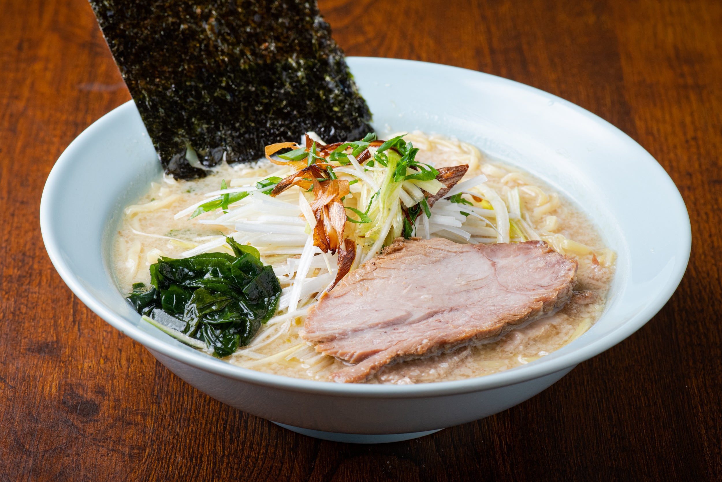 丸一日店仕込みのスープは豚骨100%を手間ひまをかけて臭みも癖もなく仕上げ、あっさりなのに旨味は濃厚。特製のかえしと合わせることで至極の一杯に仕上げました。葱は、九条ねぎ・揚げ葱・白ネギに長年時間をかけてたどり着いた4種の旨味を凝縮したオリジナルスパイスをあわせた病みつきの味。麺は、創業100年の老舗製麺所から仕入れる特製中細麺がスープと抜群の相性でお楽しみいただけます。