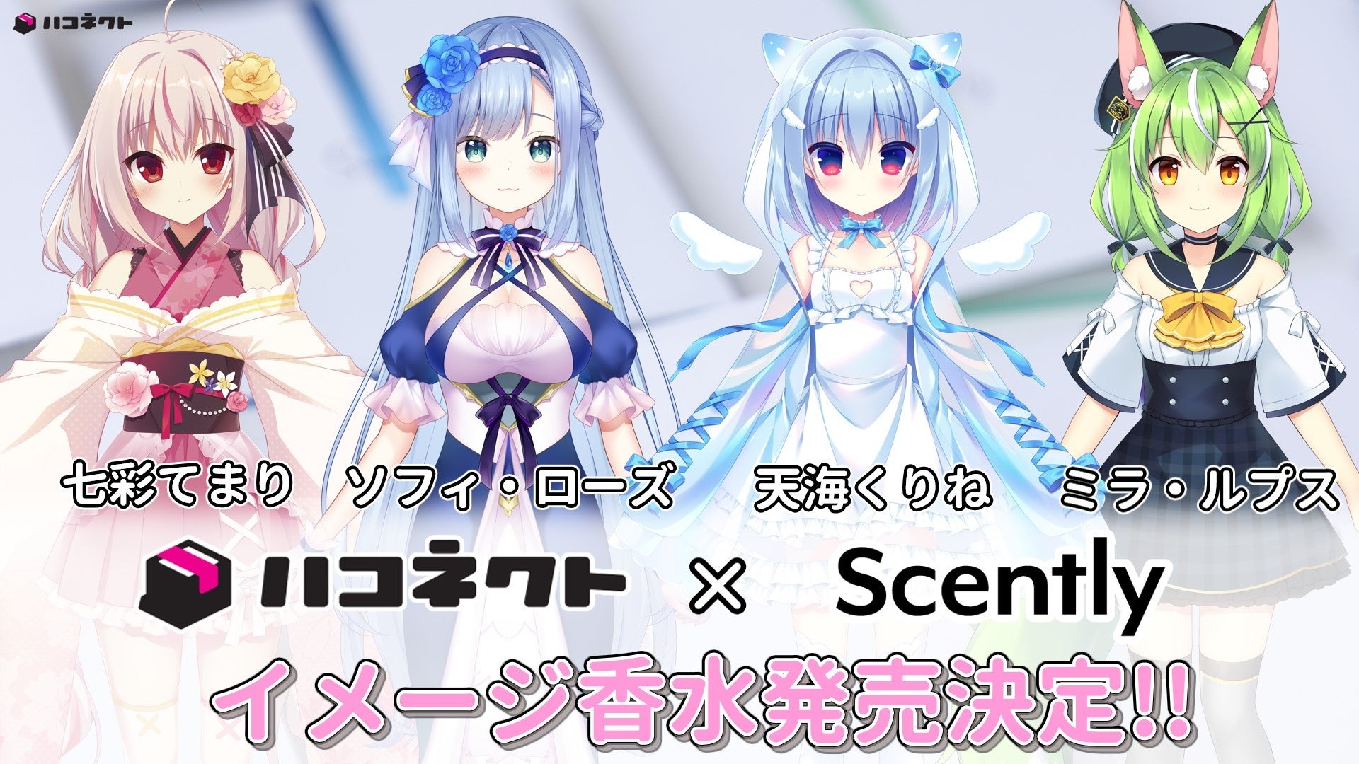 VTuber事務所「ハコネクト」×「推し香水サービスScently(セントリー)」のコラボによる、七彩てまり、ソフィ・ローズ、天海くりね、ミラ・ルプスのイメージ香水が発売決定!